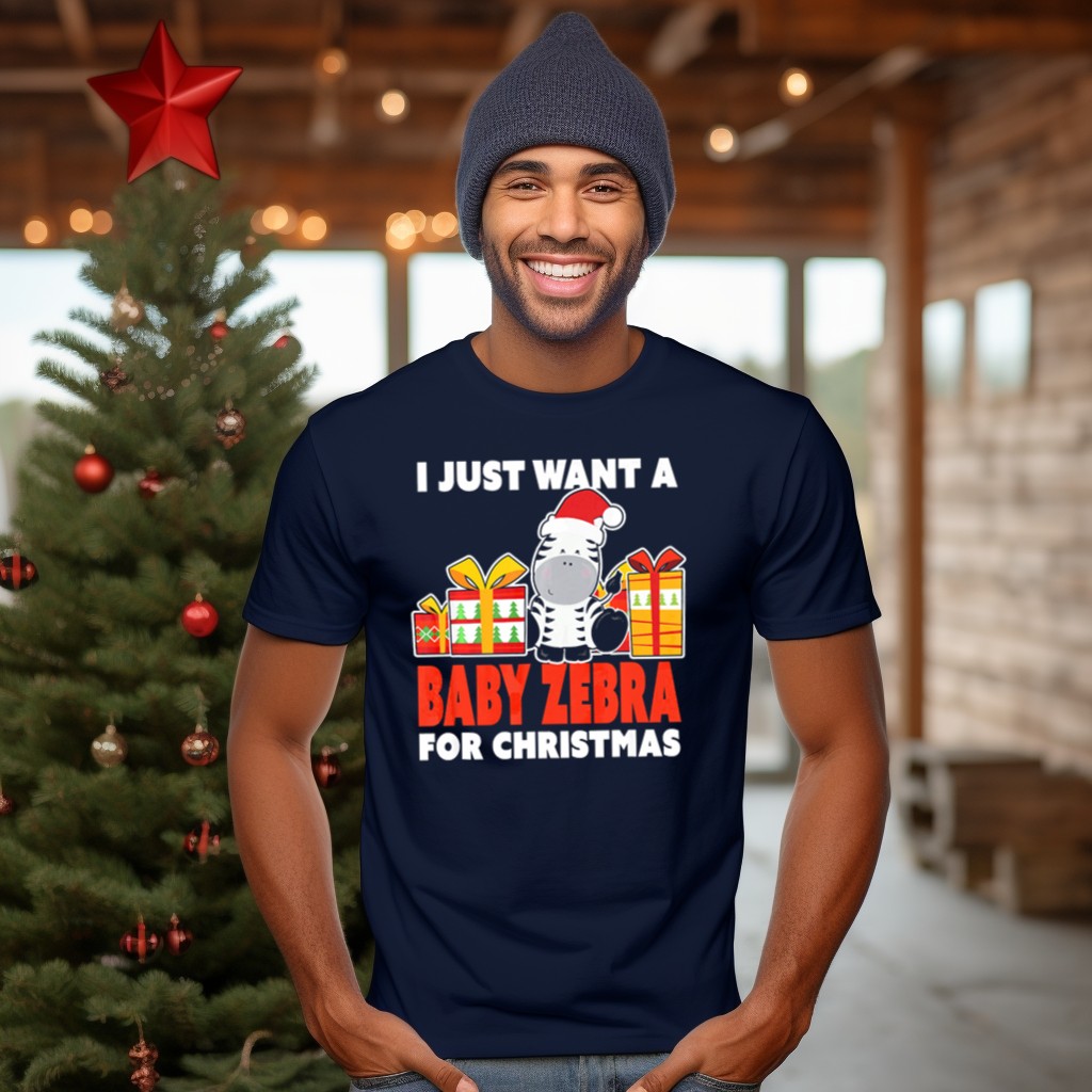 Get into the festive spirit with our “I Just Want A Baby Zebra For Christmas” T-shirt! Perfect for animal lovers and holiday enthusiasts alike, this whimsical design features an adorable baby zebra wearing a Santa hat surrounded by holiday gifts. Ideal for casual wear, themed events, or daily outings during the holiday season, this shirt is sure to spark joy and smiles wherever you go. Plus, it’s fan-made and printed in the USA, ensuring a unique touch to your festive wardrobe.