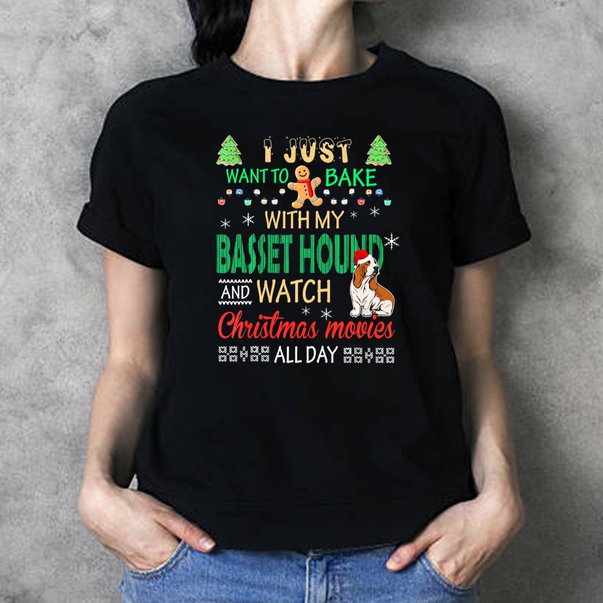 Celebrate your love for baking and cozy Christmas movie marathons with our fan-made “I Just Want To Bake With My Basset Hound And Watch Christmas Movies All Day” T-Shirt! Perfect for dog lovers and baking enthusiasts alike, this unisex tee is designed for those who cherish the simple joys of life. Whether you’re at home, at a themed event, or out with friends, this shirt is a delightful addition to your casual wardrobe, bringing warmth and cheer to every occasion.
