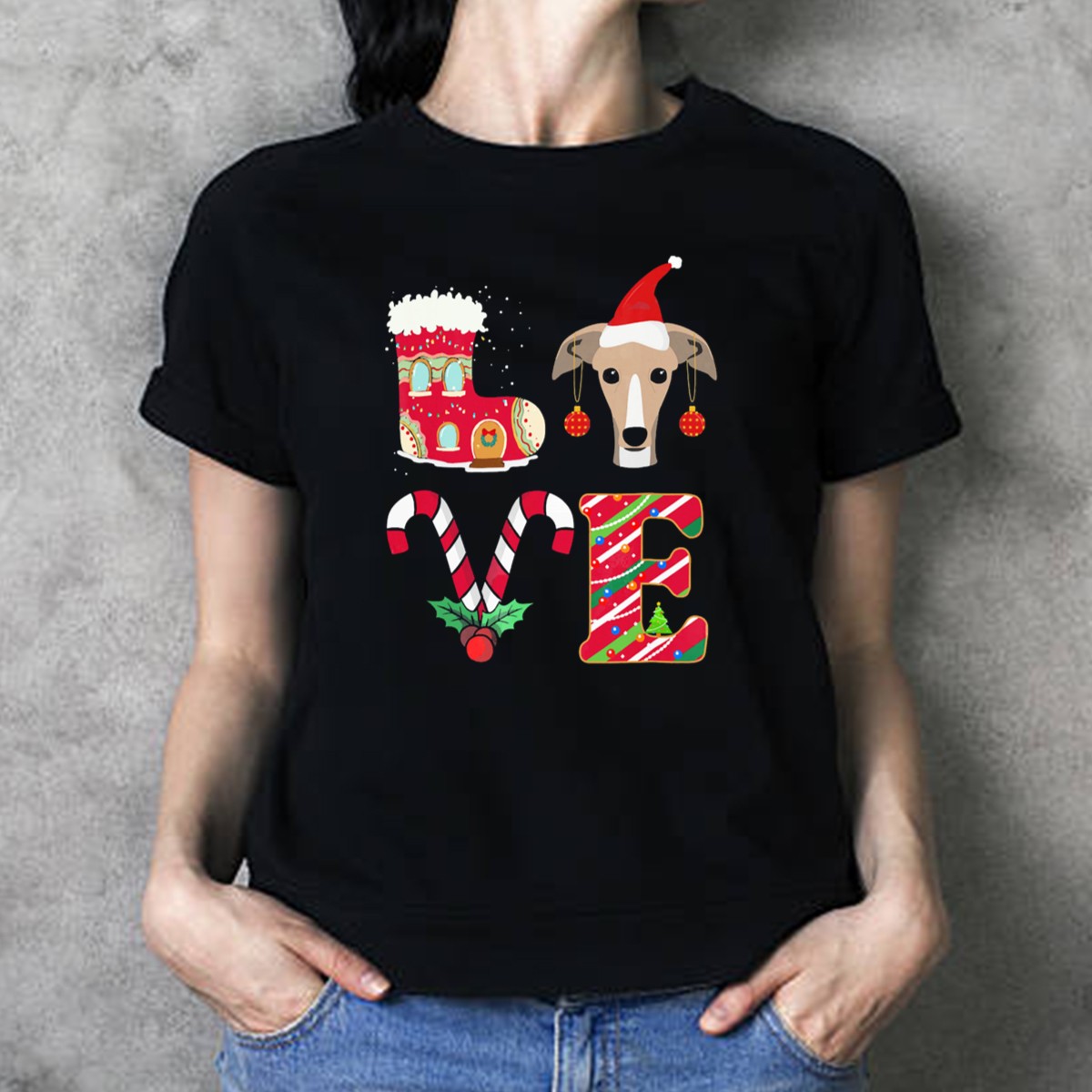 I Love My Greyhound Christmas Love Gingerbread Stocking Santa Hat Candy Cane T-Shirt