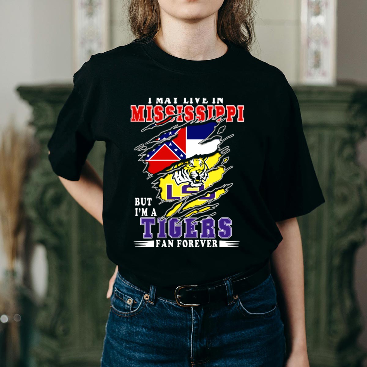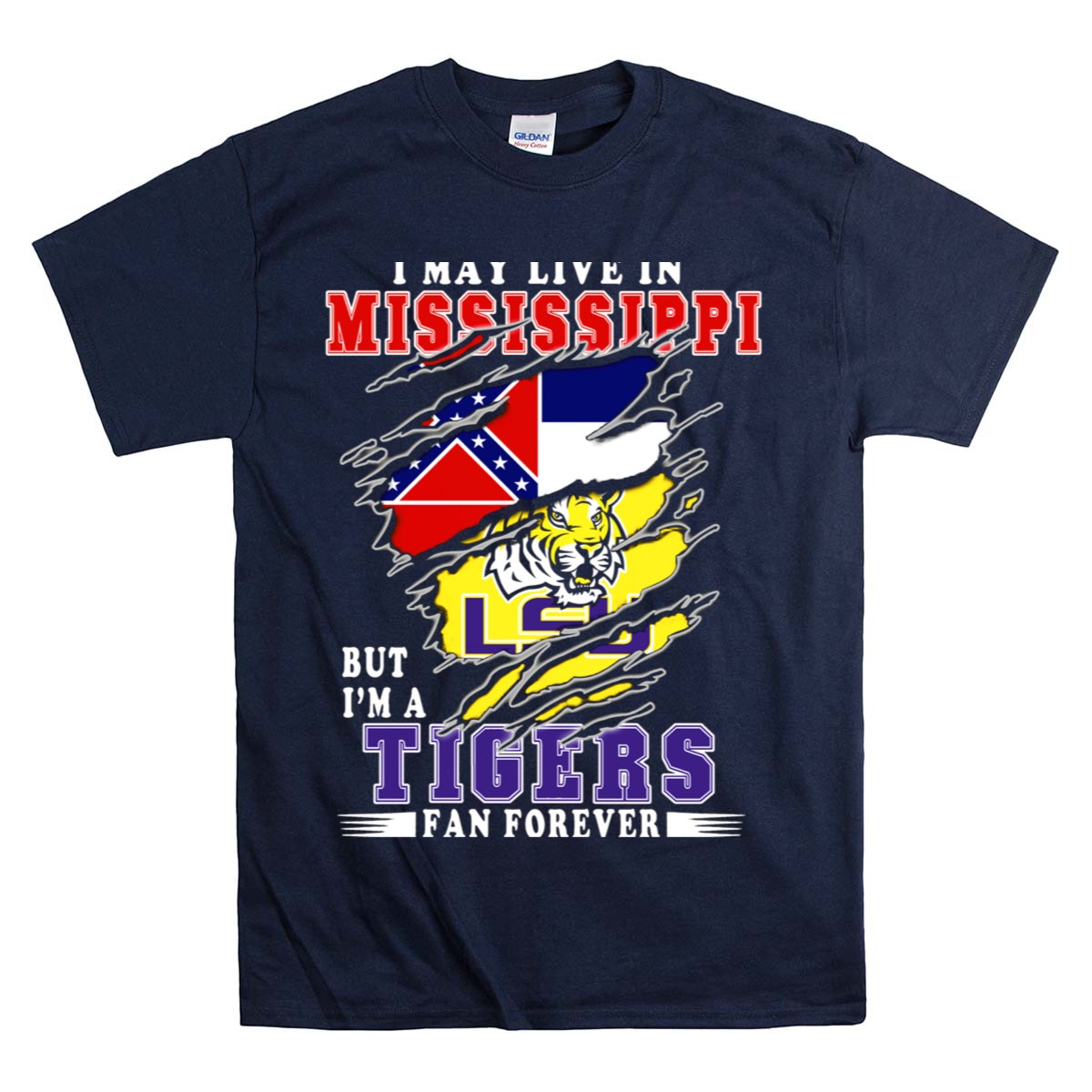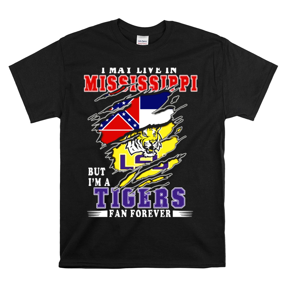 Show your unwavering support for the LSU Tigers with our “I May Live in Mississippi But I’m a LSU Tigers Fan Forever” T-shirt! Perfect for proud fans who enjoy casual outings, themed events, or simply want to showcase their team spirit in daily wear. Crafted with a fan-made design that celebrates your loyalty, this T-shirt is not just a piece of clothing; it’s a statement of pride, printed right here in the USA.