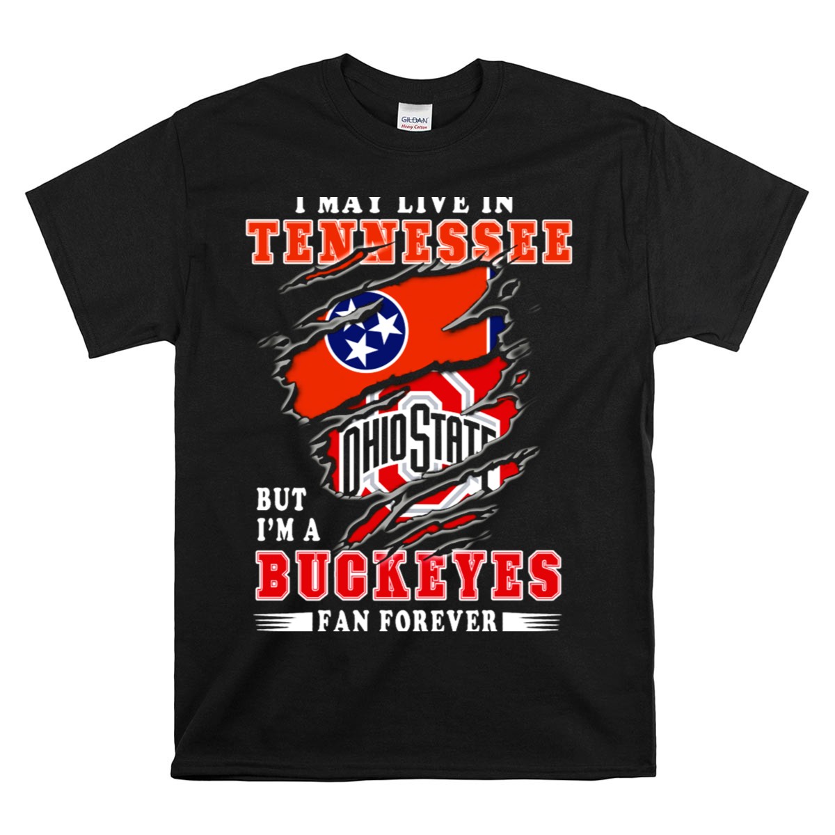 Show your unwavering support for the Ohio State Buckeyes with our “I May Live In Tennessee But I’m An Ohio State Buckeyes Fan Forever” T-shirt! This fan-made design is perfect for dedicated Buckeyes fans who want to showcase their team spirit wherever they go. Whether you’re at a game, a themed event, or just enjoying a casual day out, this classic tee is a comfortable and stylish way to represent your favorite team. Printed right here in the USA, it combines quality and passion in one unique shirt.