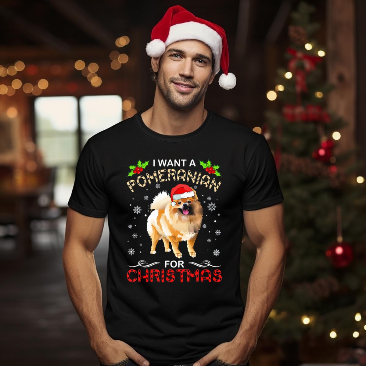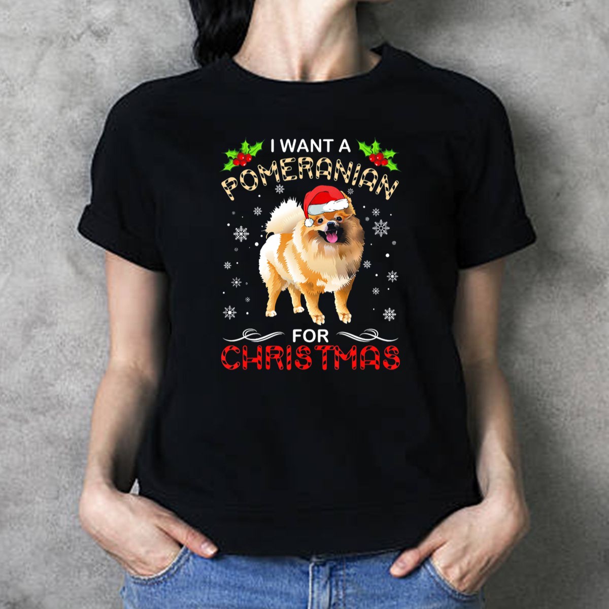 I Want A Pomeranian For Christmas Snowflakes Santa Hat Holiday Fun T Shirt