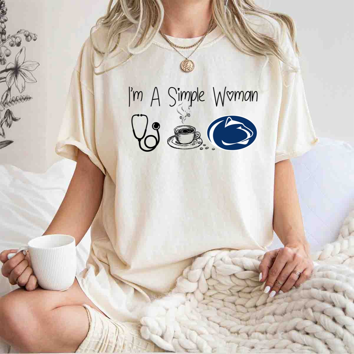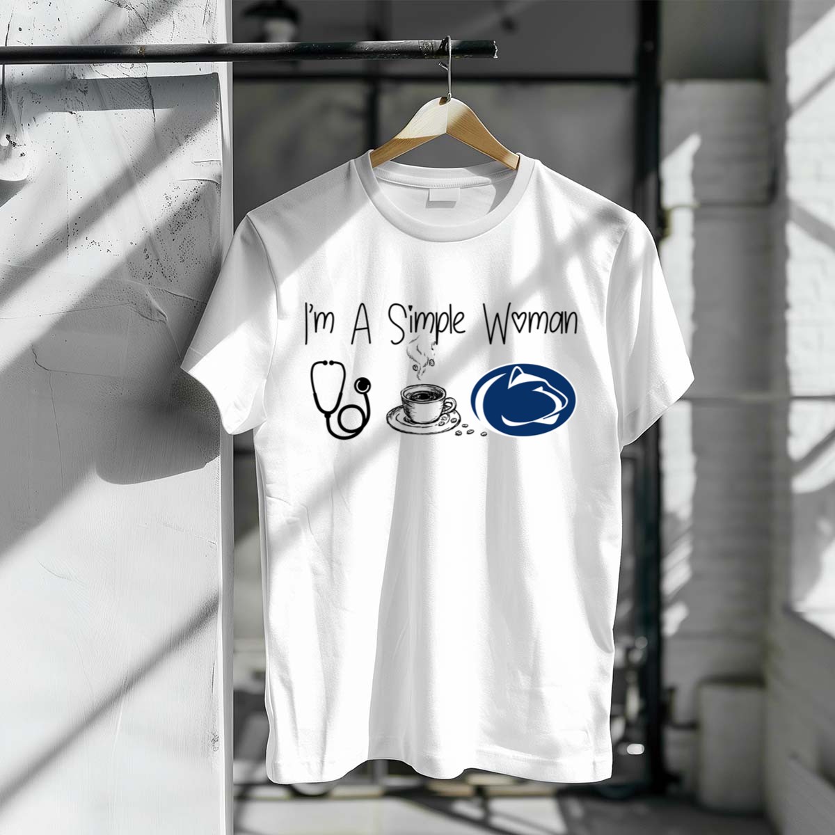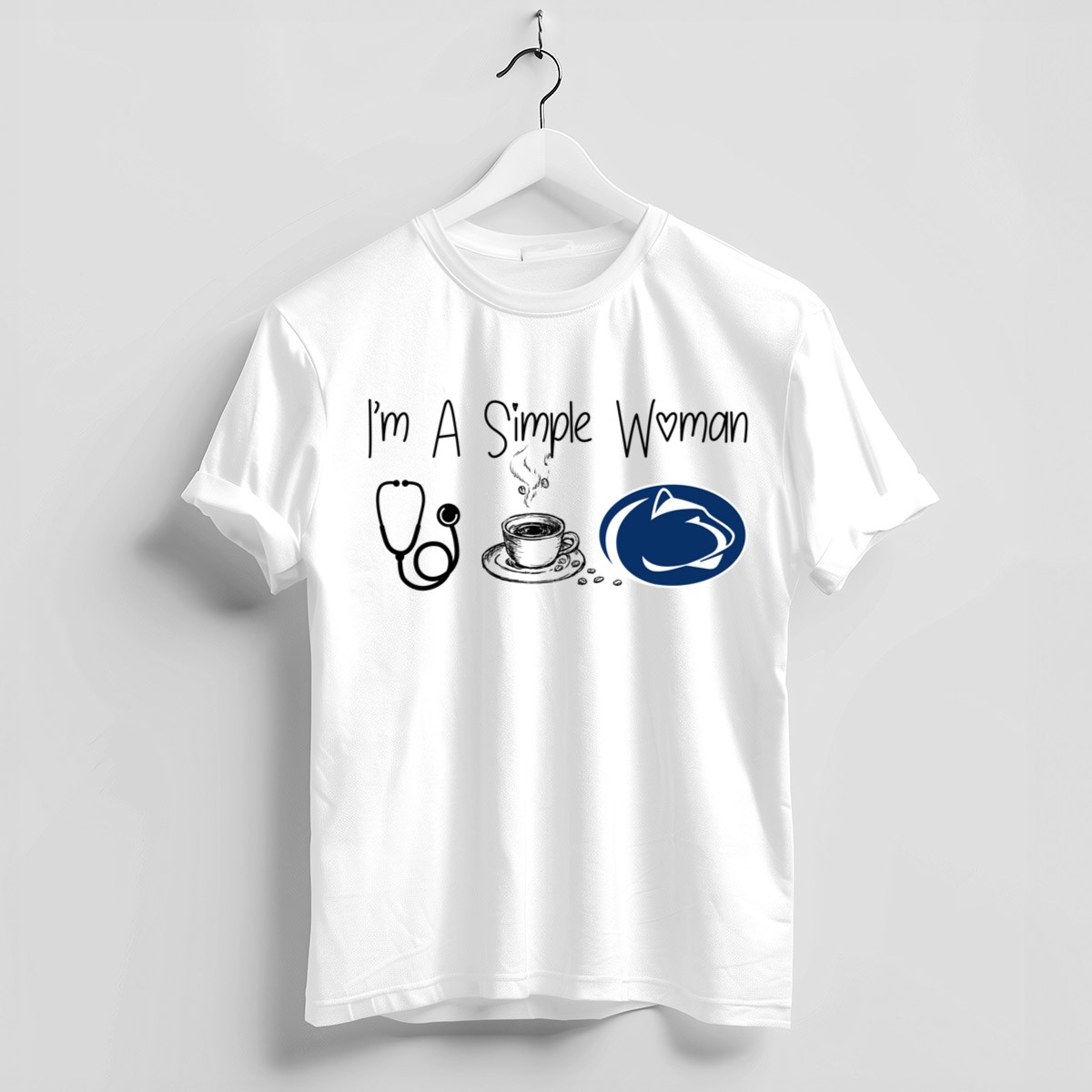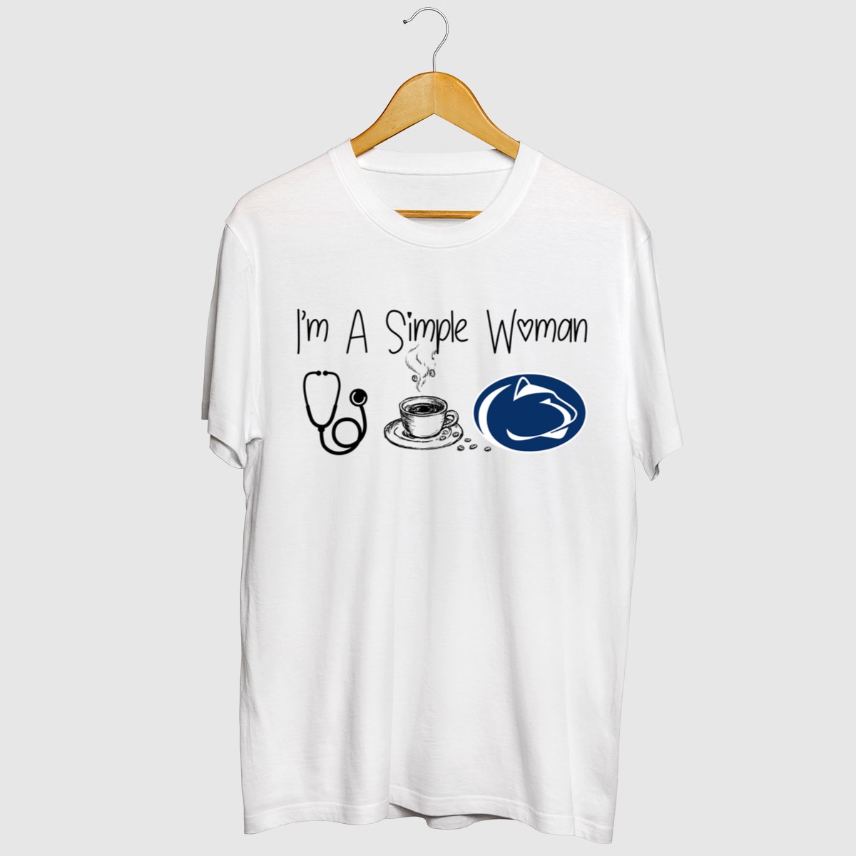 Celebrate your love for nursing, coffee, and Penn State with this fun and casual graphic T-shirt designed for the simple yet passionate woman. Perfect for everyday wear, themed events, or a relaxed day out, this shirt showcases your pride in a stylish way. Made in the USA with a fan-made design, it’s not just a T-shirt; it’s a statement!