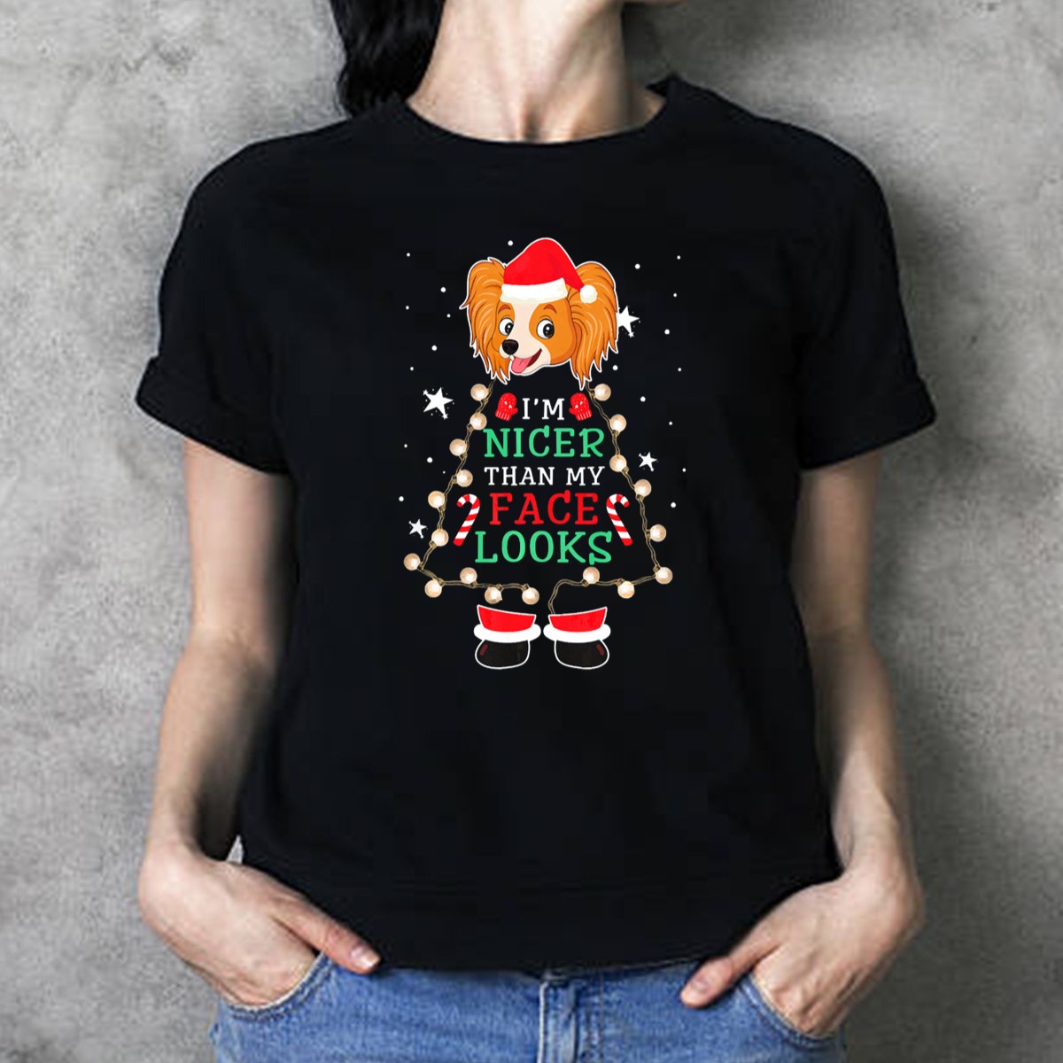 Celebrate the holiday spirit with our “IM Nicer Than My Face Looks” Papillon Dog Christmas Lights Candy Canes T-Shirt! Perfect for dog lovers and festive enthusiasts alike, this playful design adds a touch of whimsy to your casual wear. Whether you’re attending a themed event, gathering with family, or just enjoying a cozy day at home, this shirt is sure to bring smiles and compliments. Made with a fan-made design printed in the USA, it’s a unique addition to your wardrobe that showcases your love for Papillons and the joy of the season.