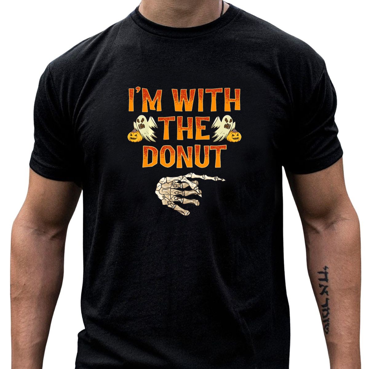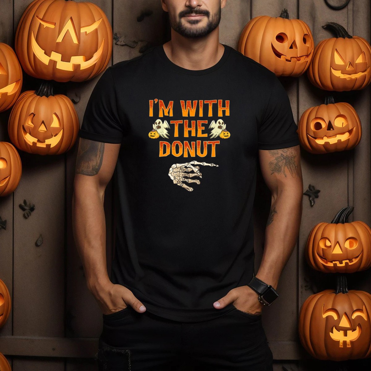 Get ready to celebrate Halloween with our “I’m With The Donut” graphic T-shirt! This fun and spooky design features playful ghosts, a skeleton hand, and a pumpkin that are sure to delight fans of all things festive. Perfect for casual outings, themed events, or simply lounging around during the spooky season, this shirt showcases a unique, fan-made design printed right here in the USA. It’s the ideal choice for those who want to add a touch of whimsy to their Halloween wardrobe!