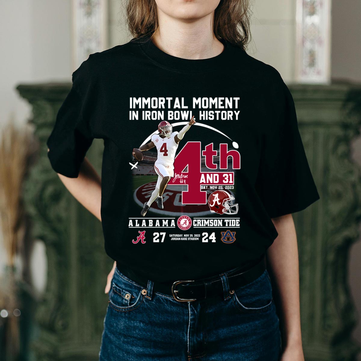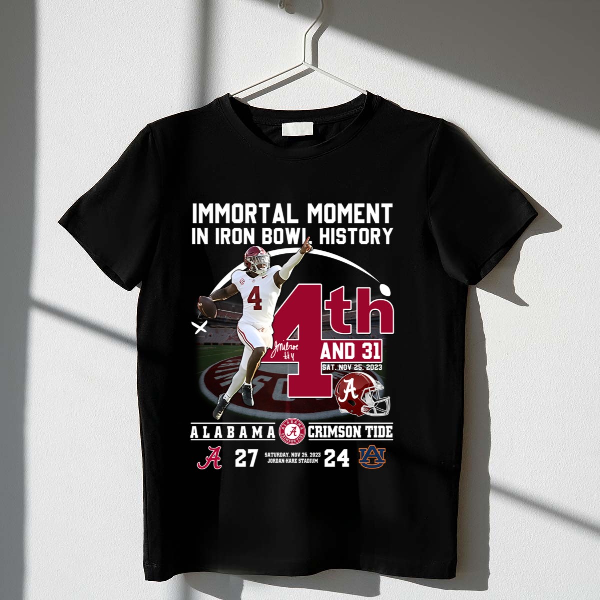 Celebrate one of the most unforgettable moments in college football history with our “Immortal Moment In Iron Bowl History 4th And 31 Alabama 27” T-shirt. Designed for passionate fans of the Alabama Crimson Tide, this shirt is perfect for game days, themed events, or casual outings. Featuring a unique fan-made graphic printed in the USA, this shirt combines comfort and style, making it a must-have for any true supporter.