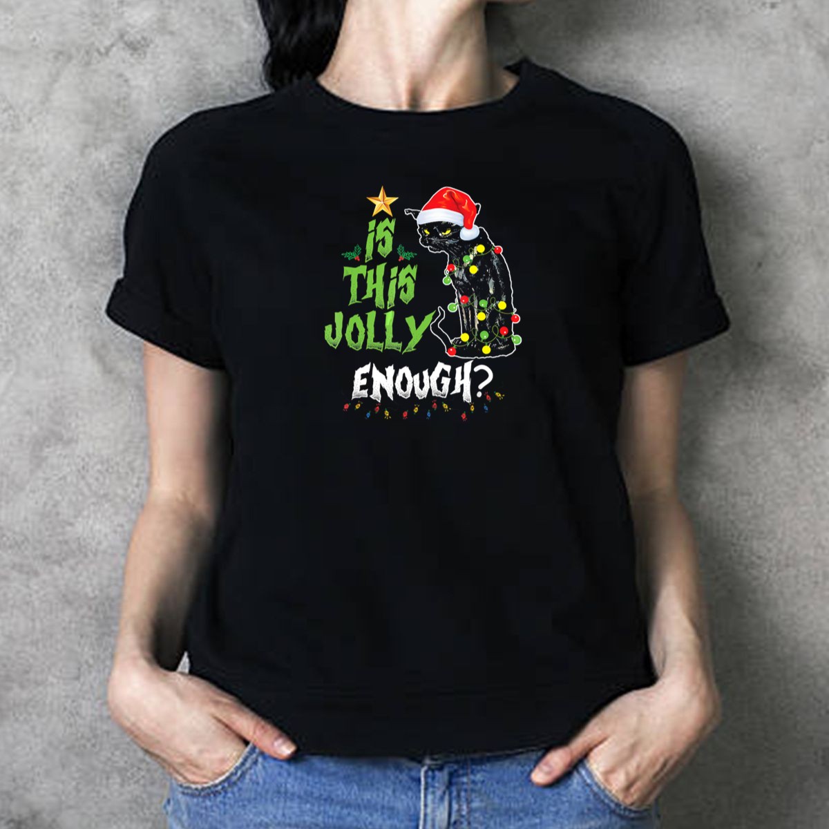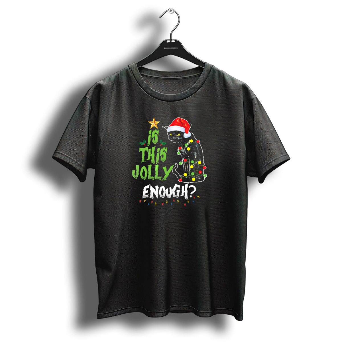 Celebrate the holiday season with a touch of humor in our “Is This Jolly Enough” Annoyed Black Cat Christmas Lights Santa Hat T-Shirt! Perfect for cat lovers and anyone looking to add a whimsical twist to their festive attire, this shirt is ideal for casual gatherings, themed events, or simply showcasing your unique style during the holidays. With its fan-made design printed in the USA, this shirt combines comfort and creativity, making it a must-have for your winter wardrobe.