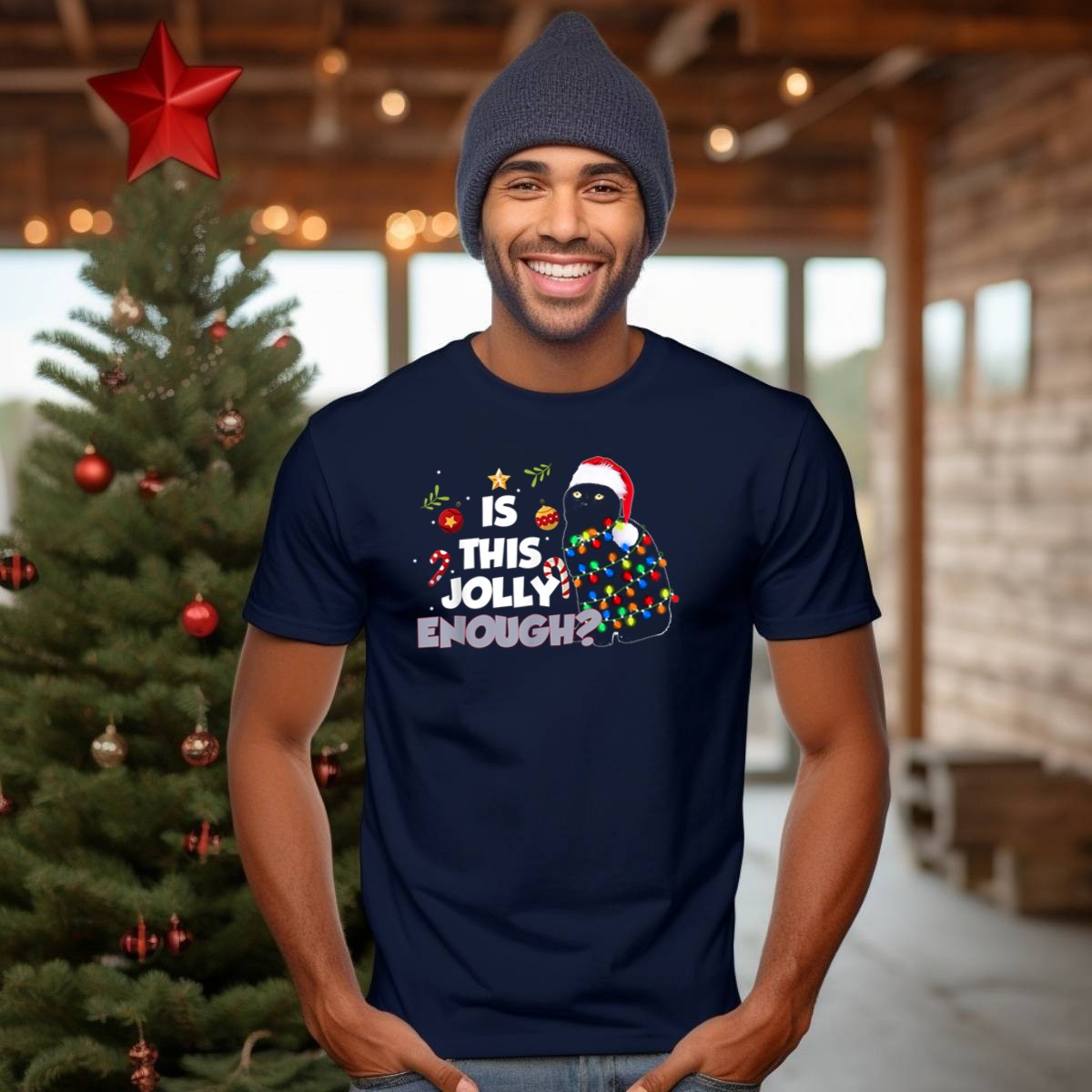 Celebrate the festive spirit with our charming “Is This Jolly Enough” Cat T-Shirt, featuring an adorable feline wrapped in Christmas lights, complete with a Santa hat and candy canes. Perfect for cat lovers and holiday enthusiasts alike, this shirt is ideal for casual wear, themed events, and daily festivities during the holiday season. Crafted with a fan-made design printed in the USA, it combines comfort with a touch of holiday cheer, making it a unique addition to your wardrobe.