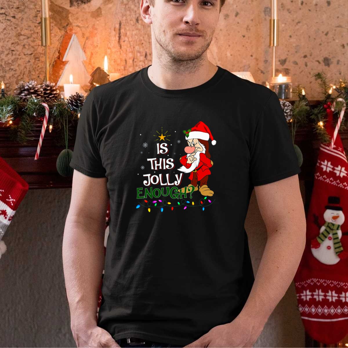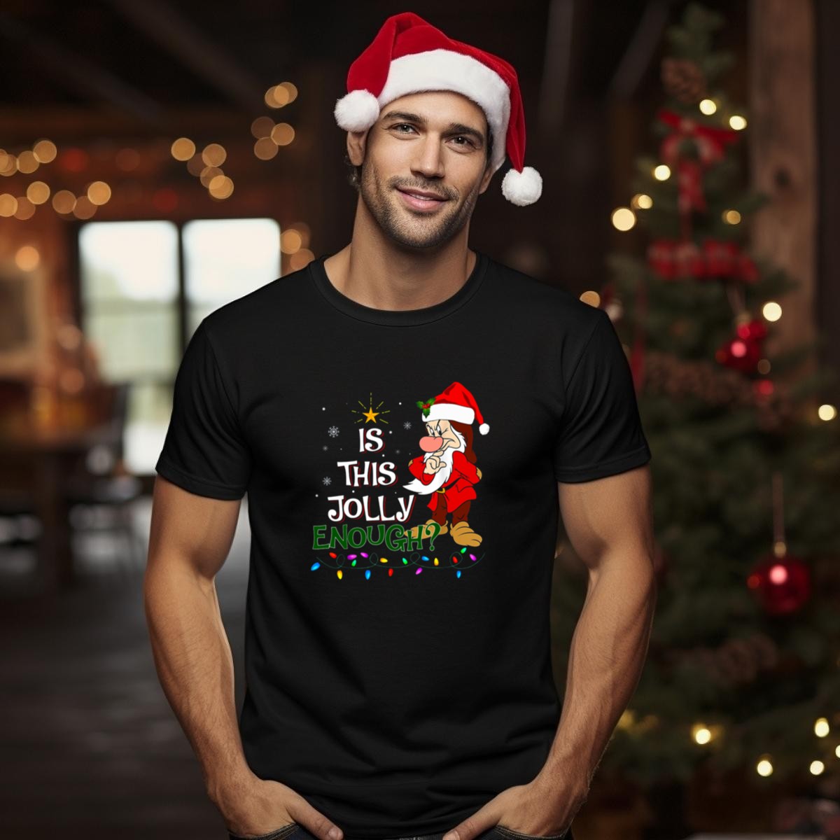 Get into the holiday spirit with our “Is This Jolly Enough Grumpy Elf With Christmas Lights” T-shirt! Perfect for anyone who enjoys a humorous take on Christmas, this fan-made design adds a playful touch to your festive wardrobe. Ideal for casual wear, themed events, or daily outings during the holiday season, this shirt is a must-have for those who appreciate a little whimsy in their celebrations. Plus, it’s printed right here in the USA, ensuring quality and originality.