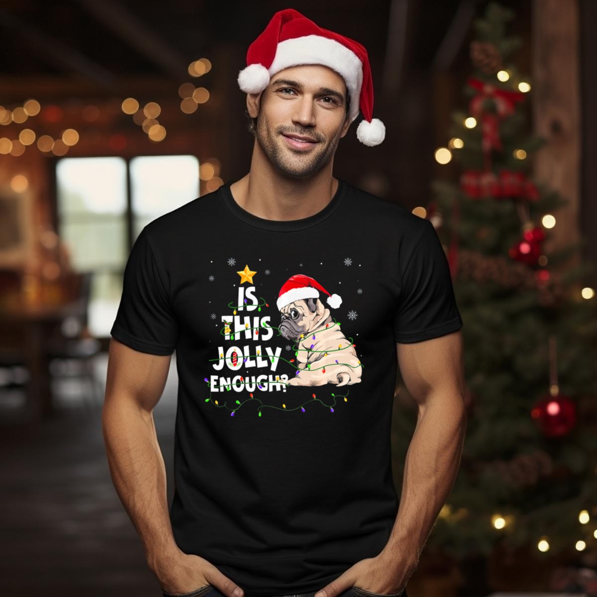 Get ready to spread some holiday cheer with our “Is This Jolly Enough” Pug Santa Hat Christmas Lights Snowflakes T-Shirt! Perfect for pug lovers and festive spirits alike, this fun and whimsical design celebrates the joy of the season. Whether you’re attending a holiday party, enjoying a cozy family gathering, or just running errands, this shirt adds a playful touch to your casual wear. Crafted with care and printed in the USA, it’s a must-have for all your festive occasions.