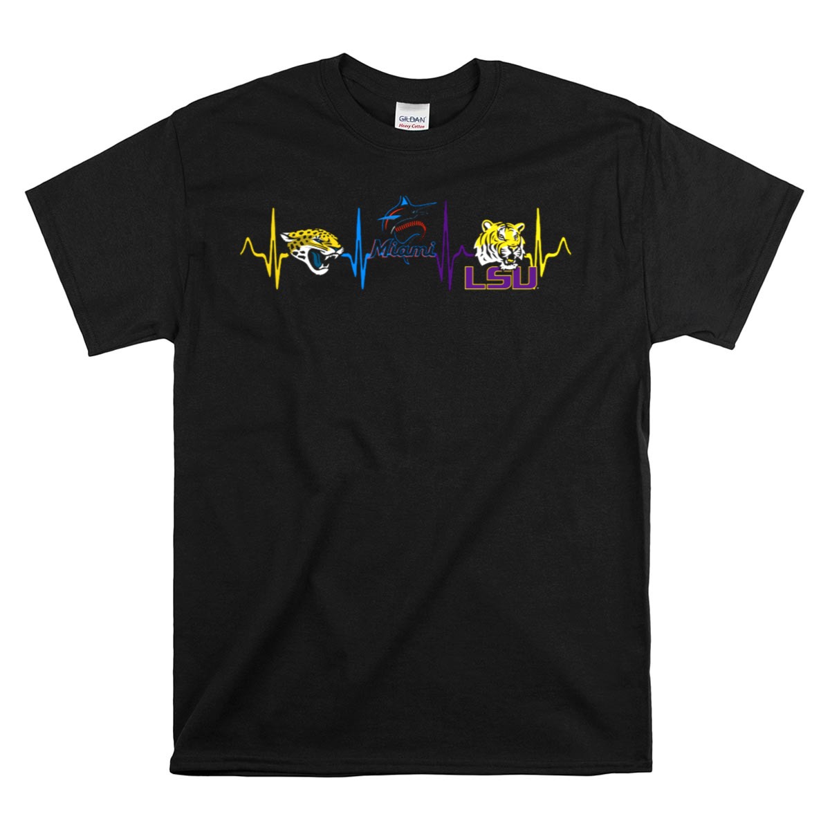 Show your passion for your favorite teams with the Jacksonville Jaguars, Miami Marlins, and LSU Tigers Heartbeat T-Shirt! This fan-made design is perfect for sports enthusiasts who want to showcase their love for these iconic teams in a stylish and comfortable way. Ideal for casual outings, themed events, or daily wear, this shirt is a must-have for any true fan looking to make a statement while enjoying all-season comfort.