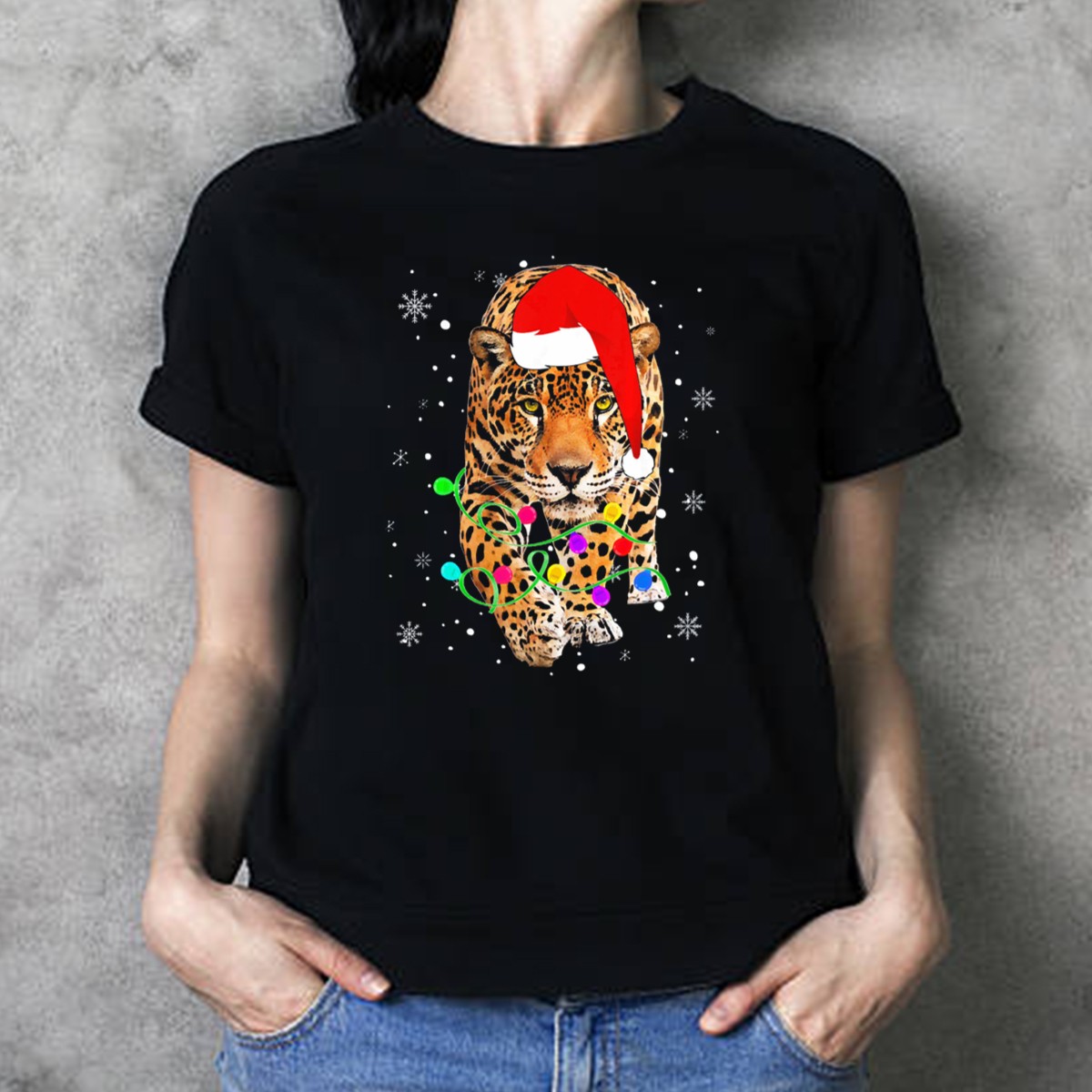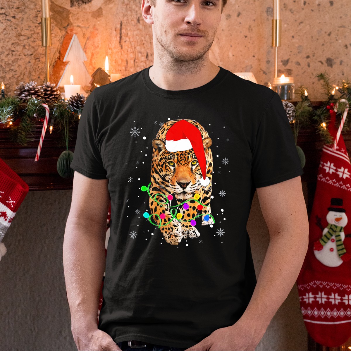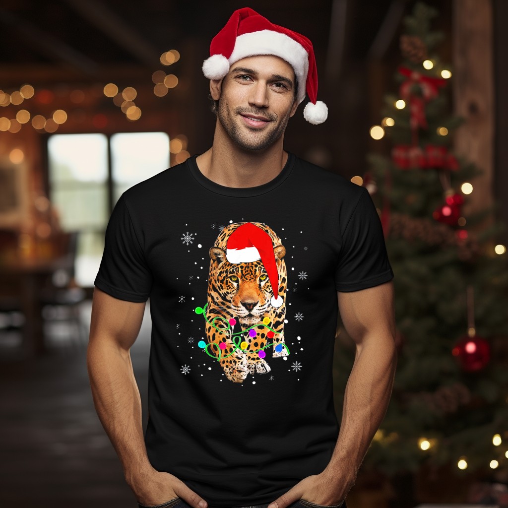 Celebrate the holiday season with our fun and festive Jaguar in Santa Hat and Christmas Lights T-Shirt! Perfect for animal lovers and holiday enthusiasts alike, this unique design adds a playful touch to your casual wardrobe. Whether you’re attending a themed event, enjoying daily wear, or just spreading holiday cheer, this shirt is a must-have for all occasions. Made with care and printed in the USA, it’s a delightful way to showcase your holiday spirit!
