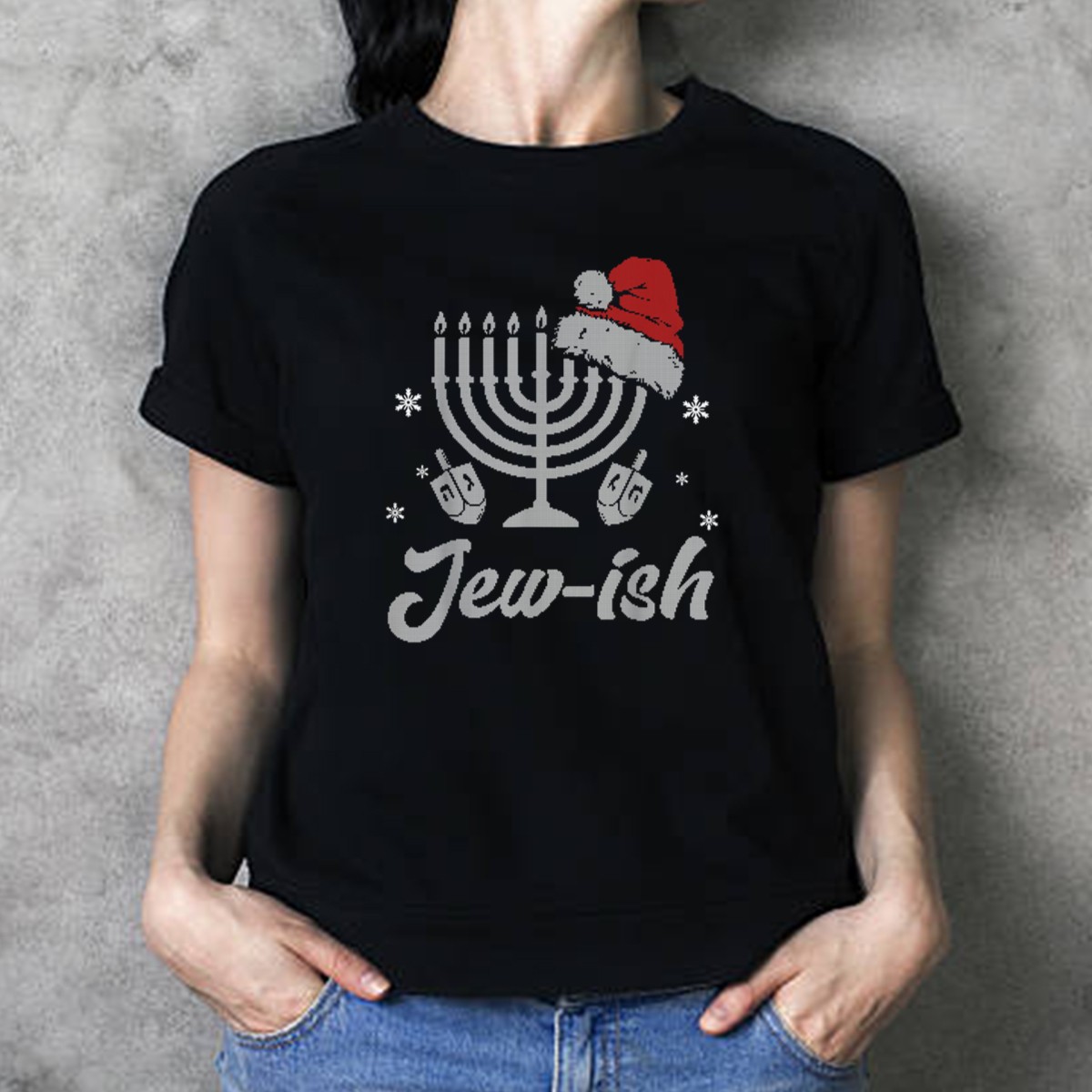Celebrate the festive season with our Jew Ish Menorah Santa Hat Ugly Christmas Hanukkah T-Shirt! Perfect for those who love to blend holiday cheer with a touch of humor, this unisex tee is ideal for family gatherings, themed parties, or simply showcasing your unique style during the holidays. With a fan-made design that combines traditional Hanukkah elements and playful Christmas motifs, this shirt is both fun and meaningful, making it a standout choice for all-season casual wear.