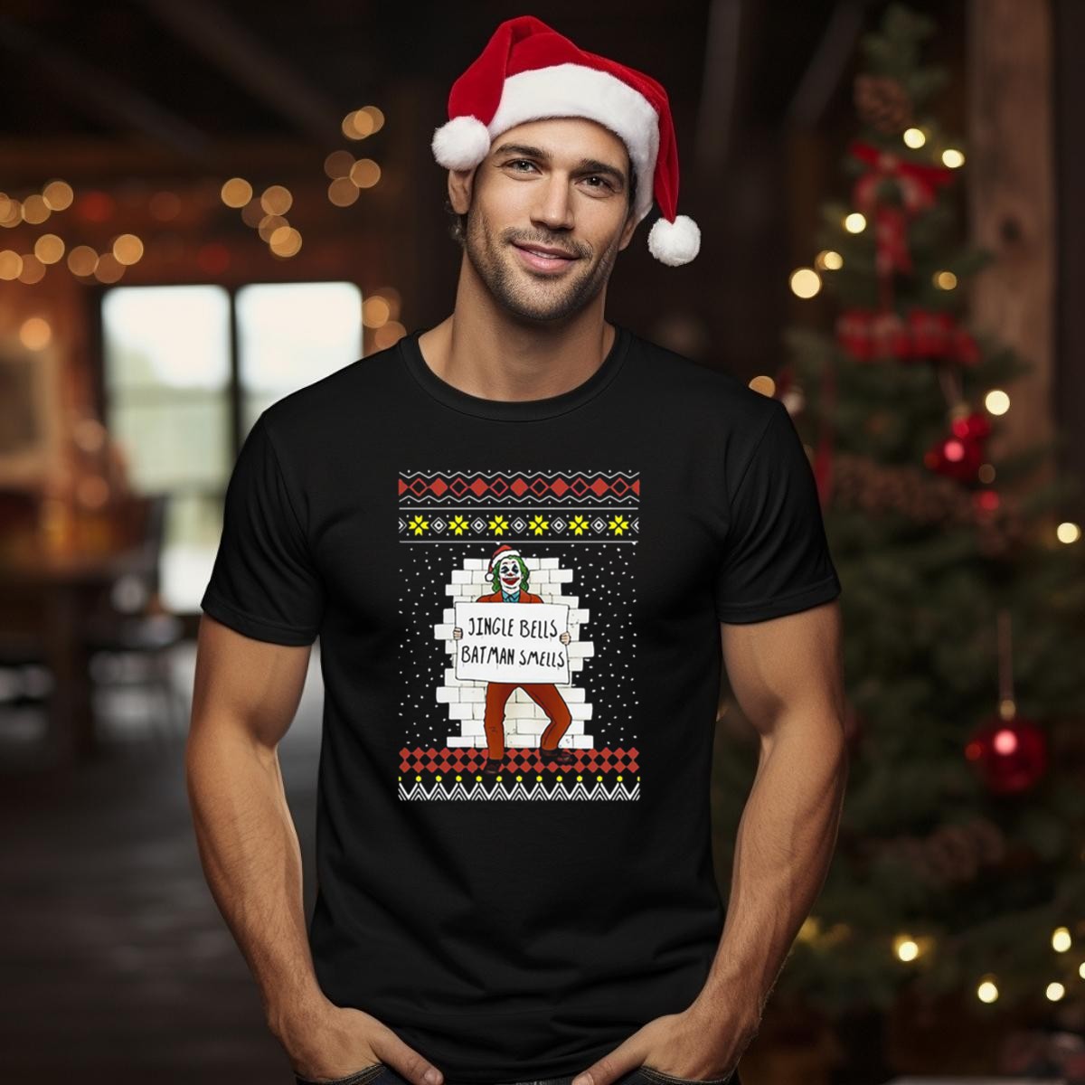 Get ready to spread some holiday cheer with our Jingle Bells Batman Smells Joker In Santa Hat Ugly Christmas T-Shirt! Perfect for fans of the iconic comic book universe, this fun and festive tee is an excellent choice for casual wear, themed events, or just to bring a smile to your friends and family during the holiday season. Made with a unique fan-made design and proudly printed in the USA, it’s sure to make you the life of the party!