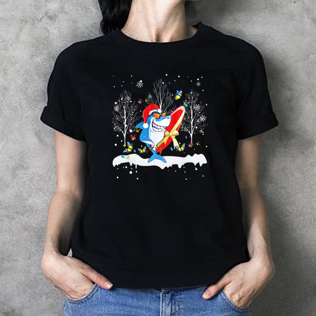 Be the first to review “Jolly Shark Santa Surfing Snowy Christmas Butterfly Scene T-Shirt”