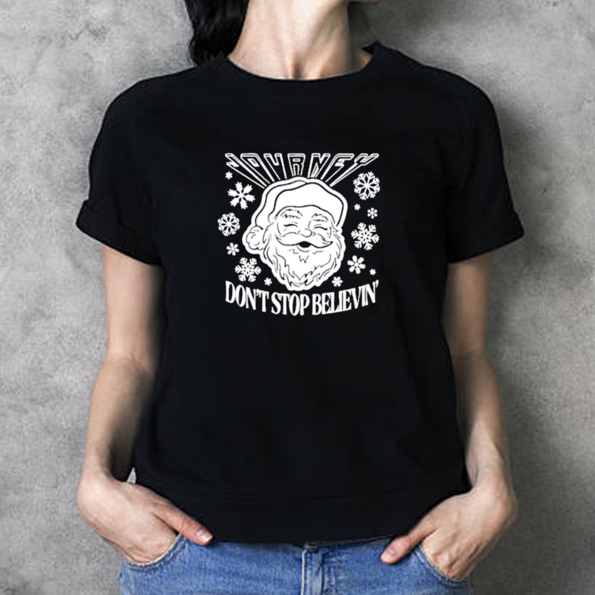 Embrace the festive spirit with our Journey Don’t Stop Believin’ Christmas Santa Snowflakes T-Shirt, perfect for music lovers and holiday enthusiasts alike. This fan-made design captures the essence of the classic tune, making it an ideal choice for casual wear during themed events, family gatherings, or simply spreading holiday cheer. Crafted with care and printed in the USA, this shirt is a unique addition to your all-season wardrobe.