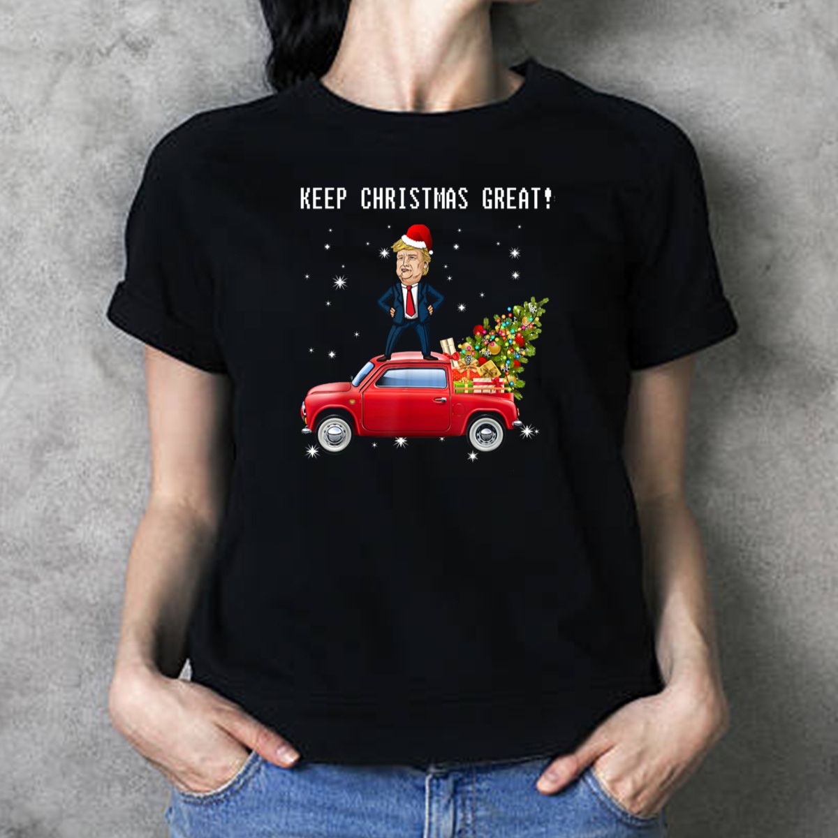 Keep Christmas Great Trump Santa Hat Standing On Red Truck With Christmas Tree And Gifts T Shirt 1