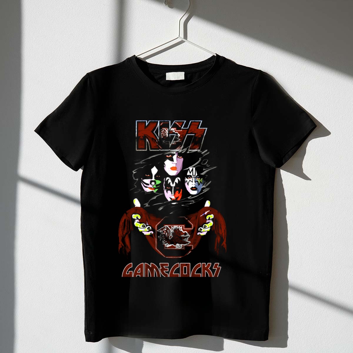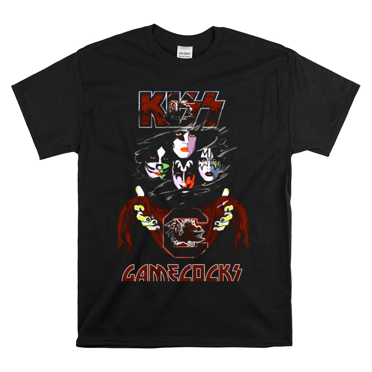 Show your team spirit and musical passion with our KISS South Carolina Gamecocks Rock Band Faces and Mascot T-Shirt! This fan-made design seamlessly blends the iconic KISS rock band aesthetics with the fierce pride of the Gamecocks, making it the perfect choice for casual outings, themed events, or daily wear. Made for die-hard fans who want to stand out in any crowd, this shirt is not just a piece of clothing; it’s a statement of your loyalty and love for both music and your team!