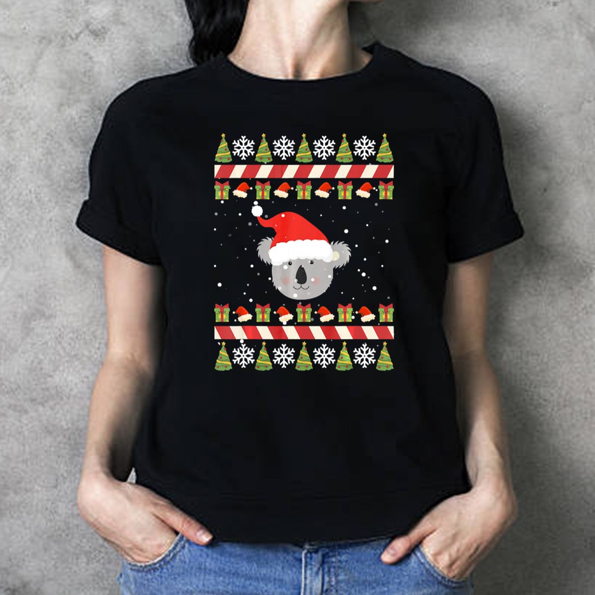 Koala Santa Hat Snowflakes Christmas Trees Gifts Ugly Xmas T Shirt