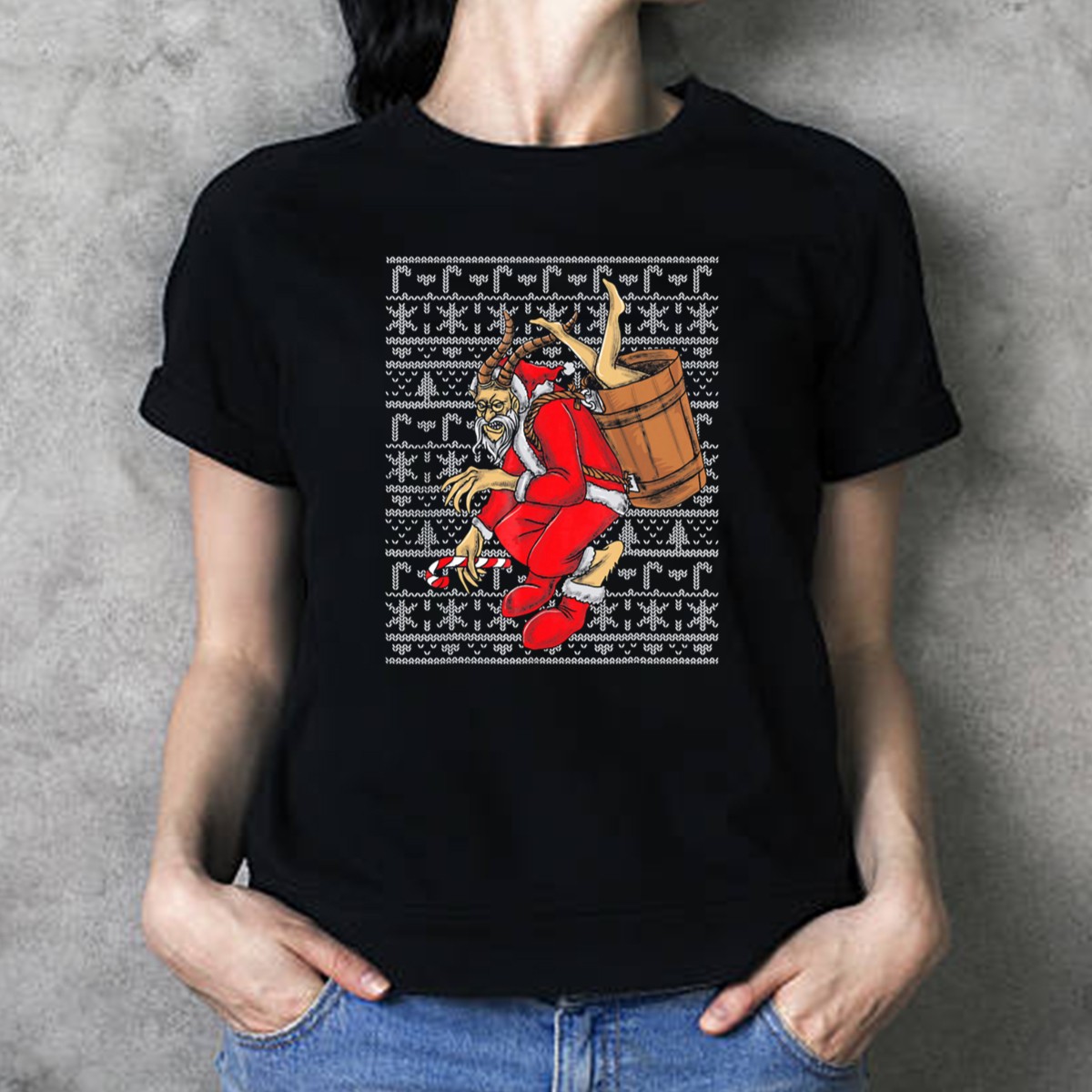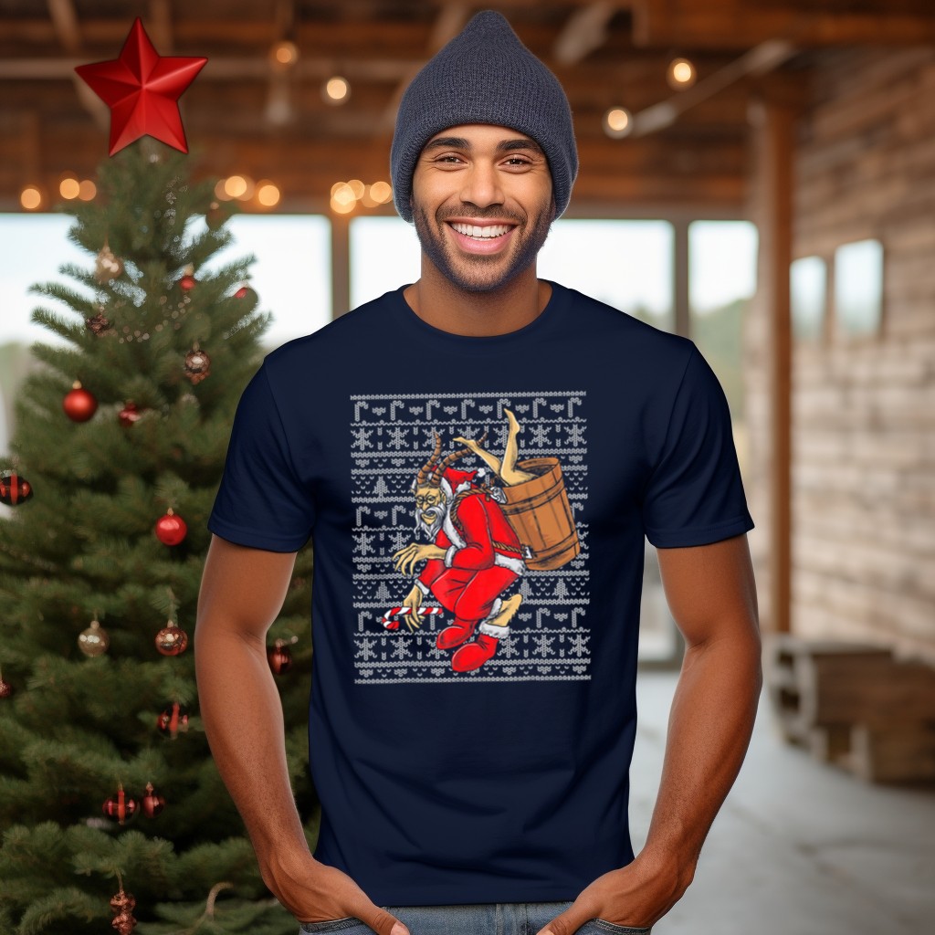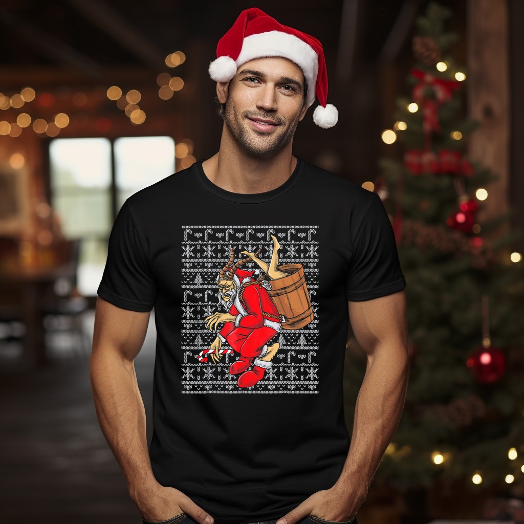 Be the first to review “Krampus Ugly Christmas Sweater Style Santa With Barrel And Candy Cane T-Shirt”
