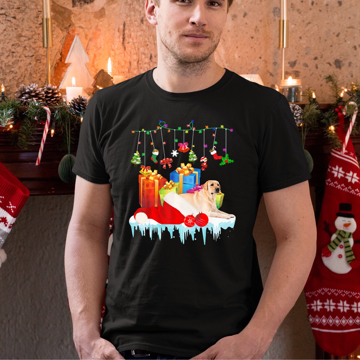 Be the first to review “Labrador Retriever With Santa Hat And Christmas Gifts Under Festive Lights T-Shirt”