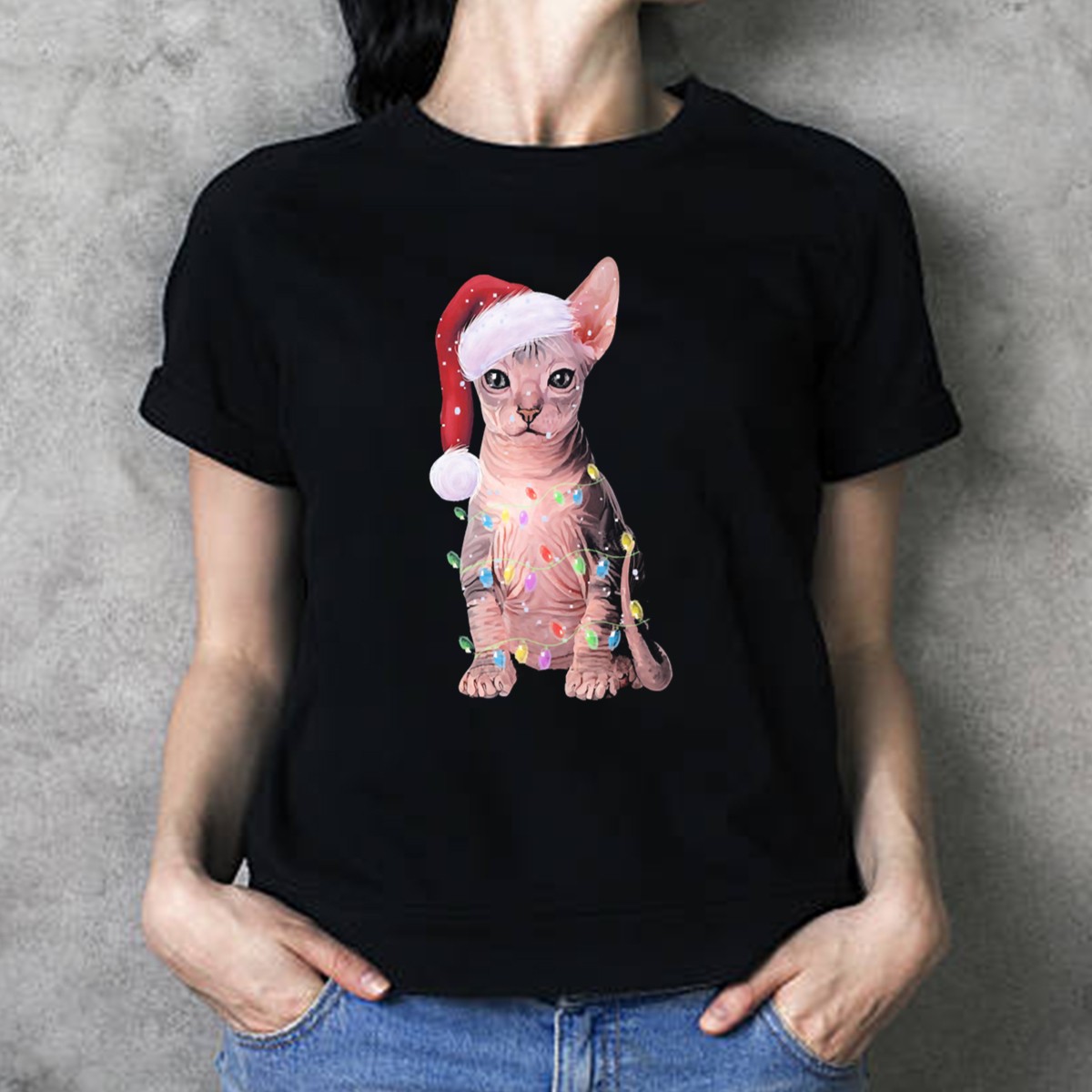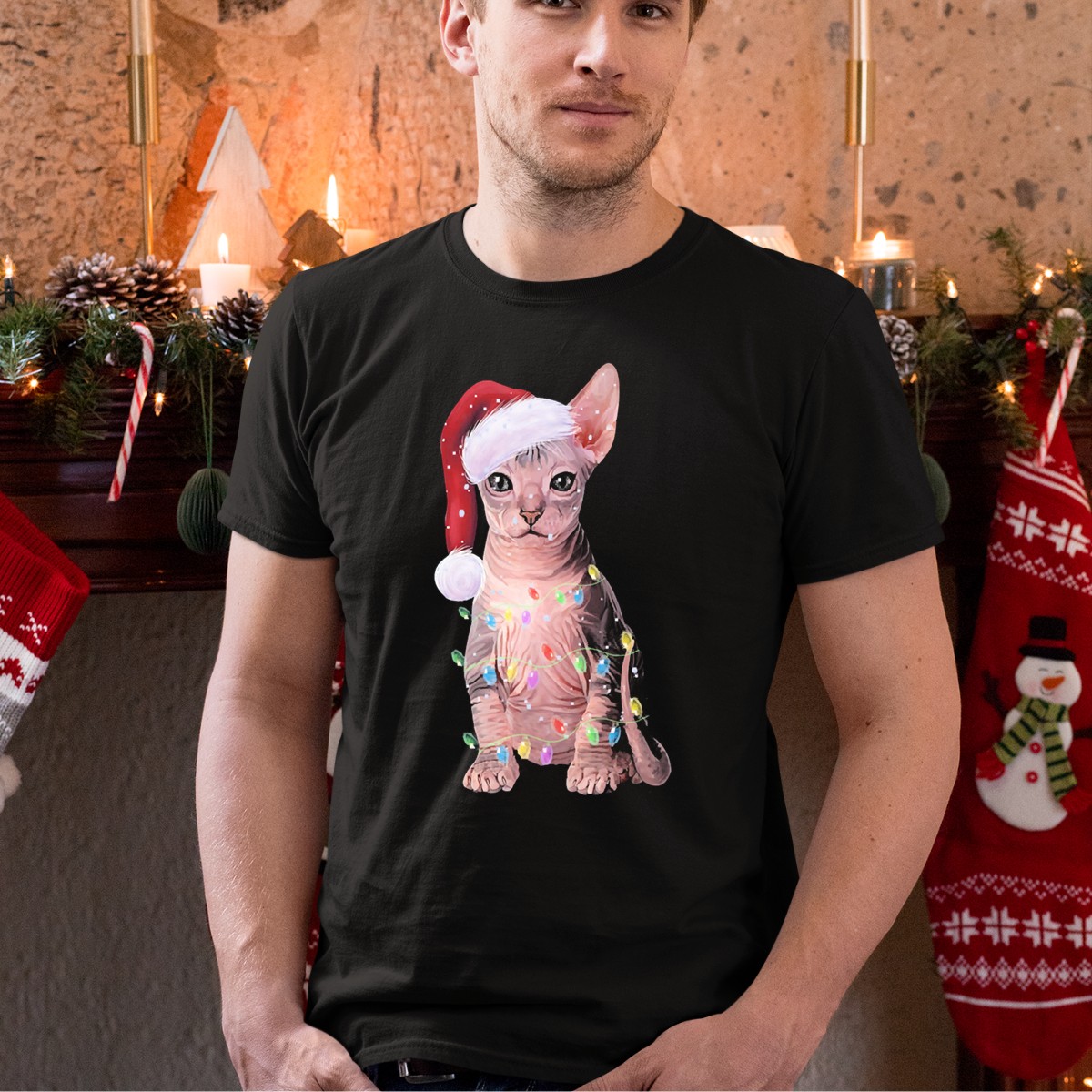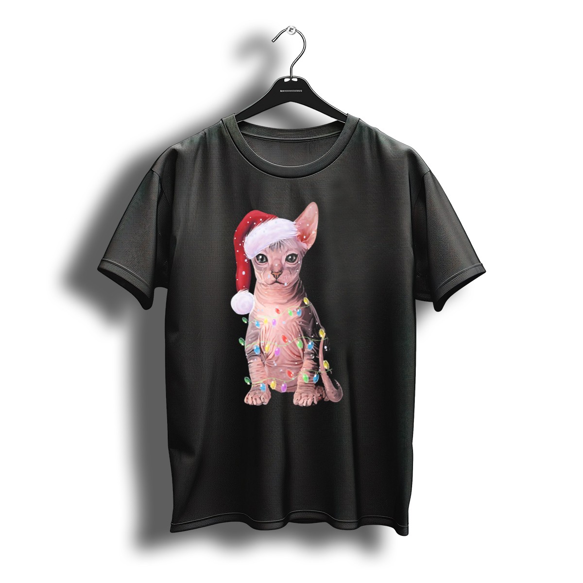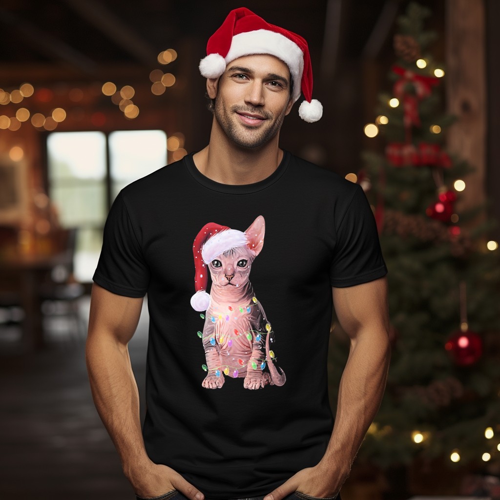 Celebrate the magic of the holiday season with our “Let It Snow” Christmas T-shirt featuring an adorable Sphynx cat donned in a Santa hat and surrounded by festive lights. This shirt is perfect for cat lovers and anyone looking to spread some holiday cheer at casual gatherings, themed events, or simply while enjoying a cozy day at home. Made with love and printed in the USA, this fan-made design is sure to bring smiles and warmth to your winter wardrobe.