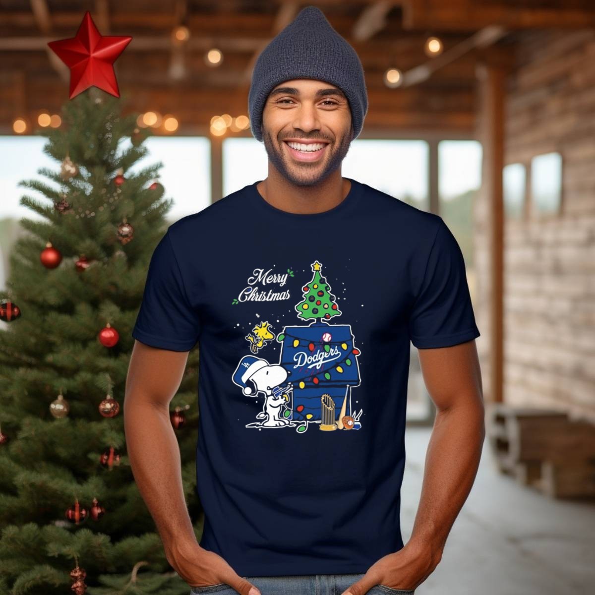 Los Angeles Dodgers Snoopy Merry Christmas Tree 2024 Peanuts Woodstock Santa Hat T Shirt