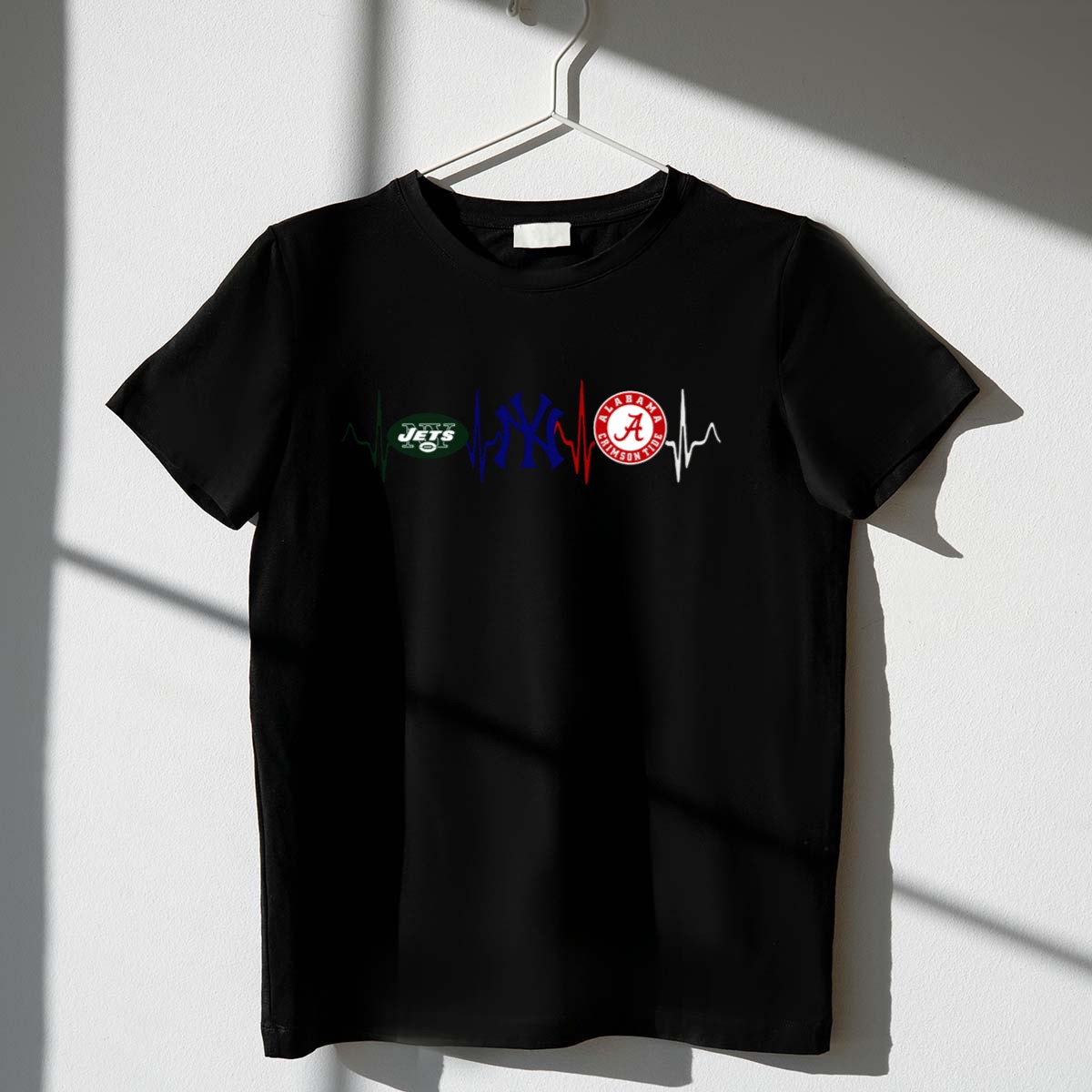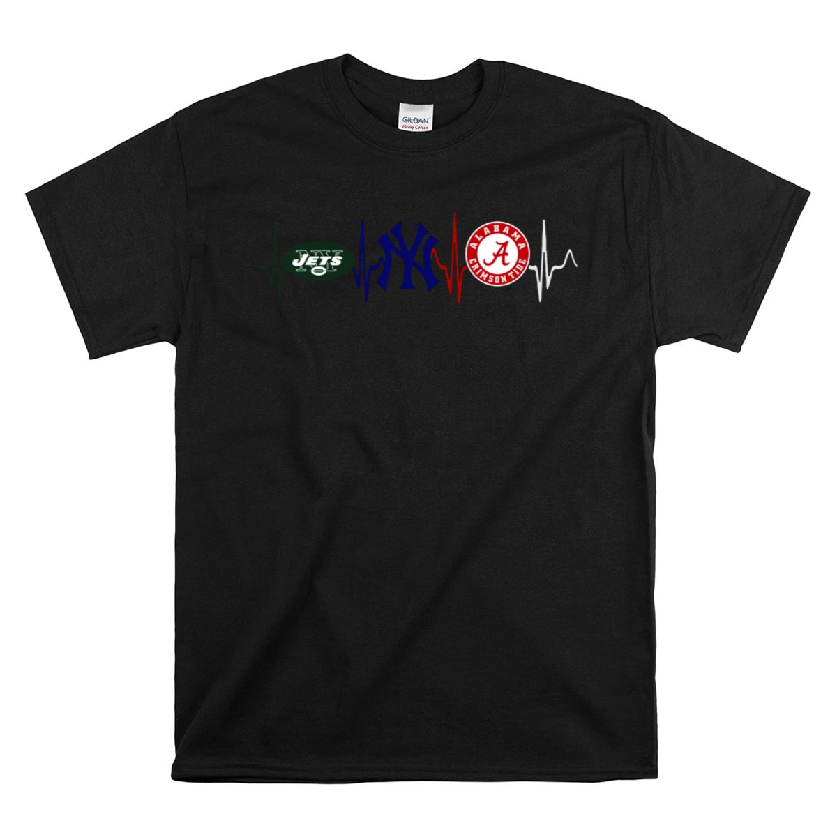 Show your unwavering love for the New York Jets, Yankees, and Alabama Crimson Tide with this unique heartbeat graphic T-shirt! Perfect for fans who live and breathe their teams, this shirt is ideal for casual outings, themed events, or simply showing off your pride during daily wear. Crafted for comfort and style, this fan-made design is printed in the USA, making it a standout choice for any sports enthusiast.
