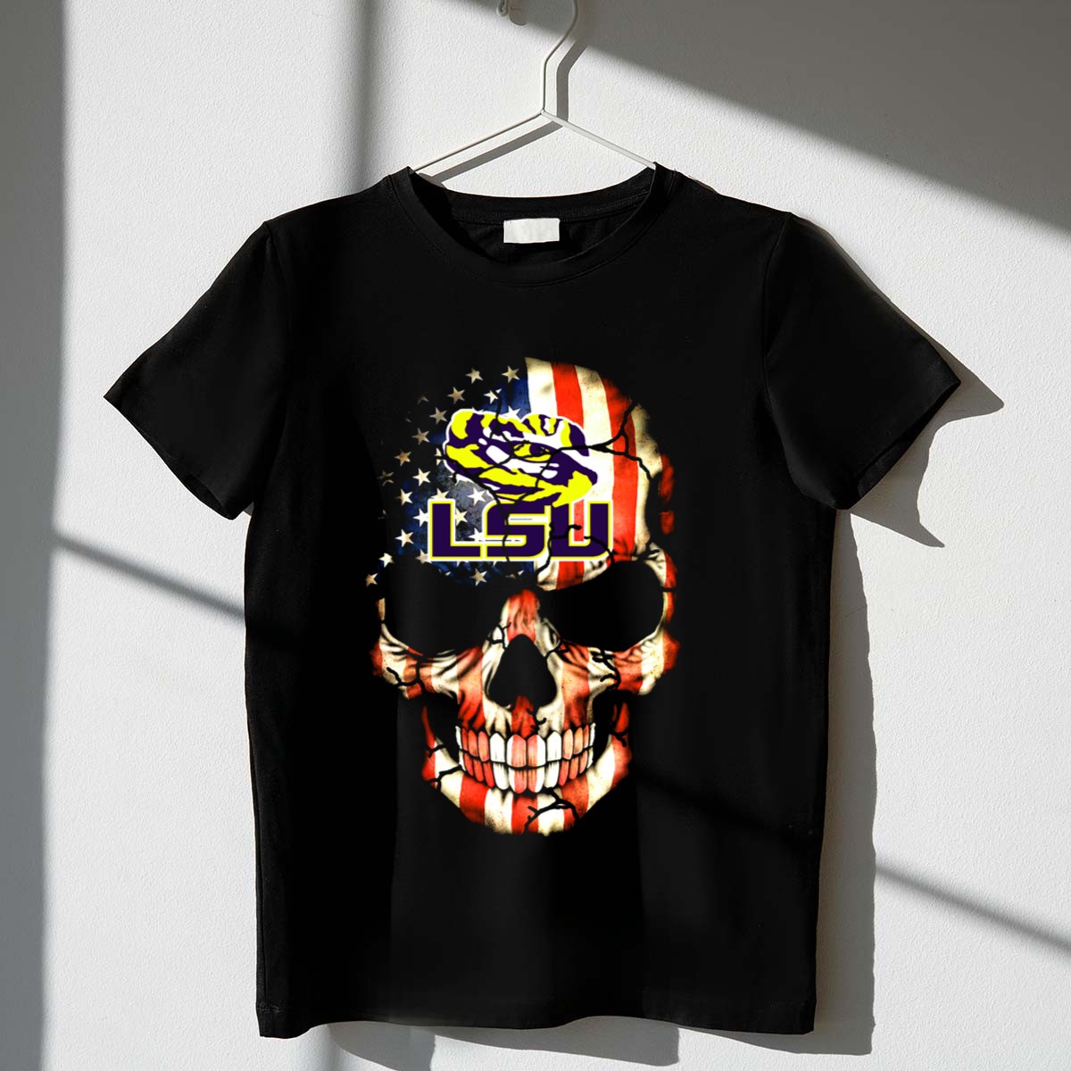Show your fierce loyalty to the LSU Tigers with this uniquely designed American Flag Skull T-shirt. Perfect for die-hard fans and casual wearers alike, this shirt combines a bold graphic with a classic fit, making it ideal for game days, themed events, or just hanging out with friends. Crafted for comfort and style, it’s a must-have for anyone looking to showcase their team spirit in a standout way.