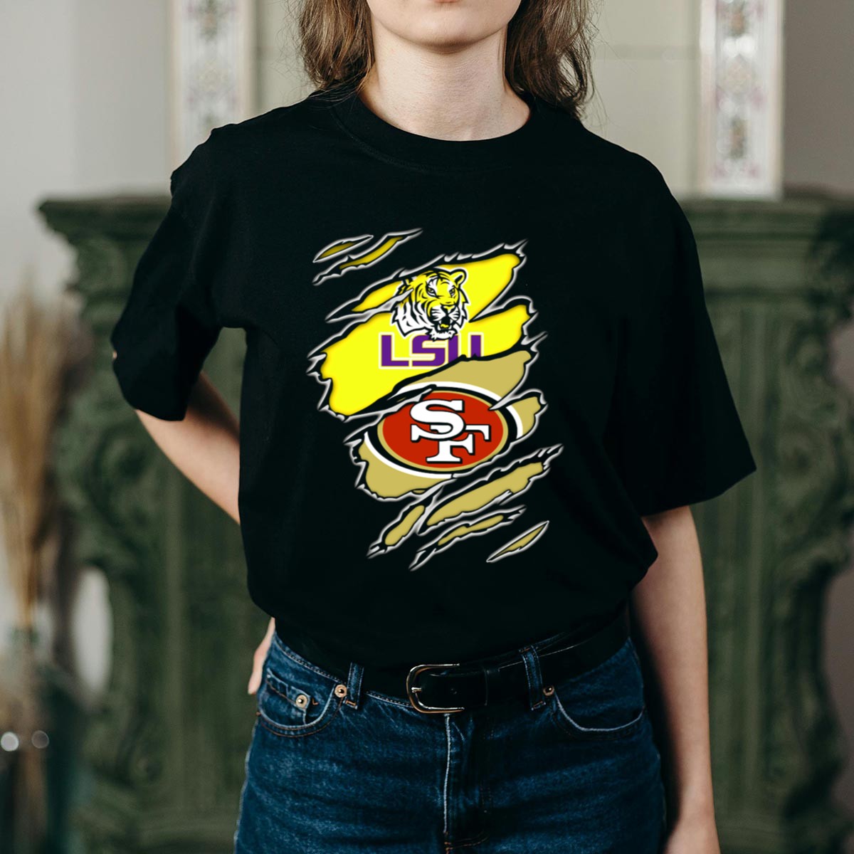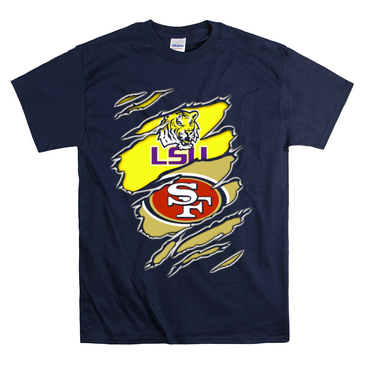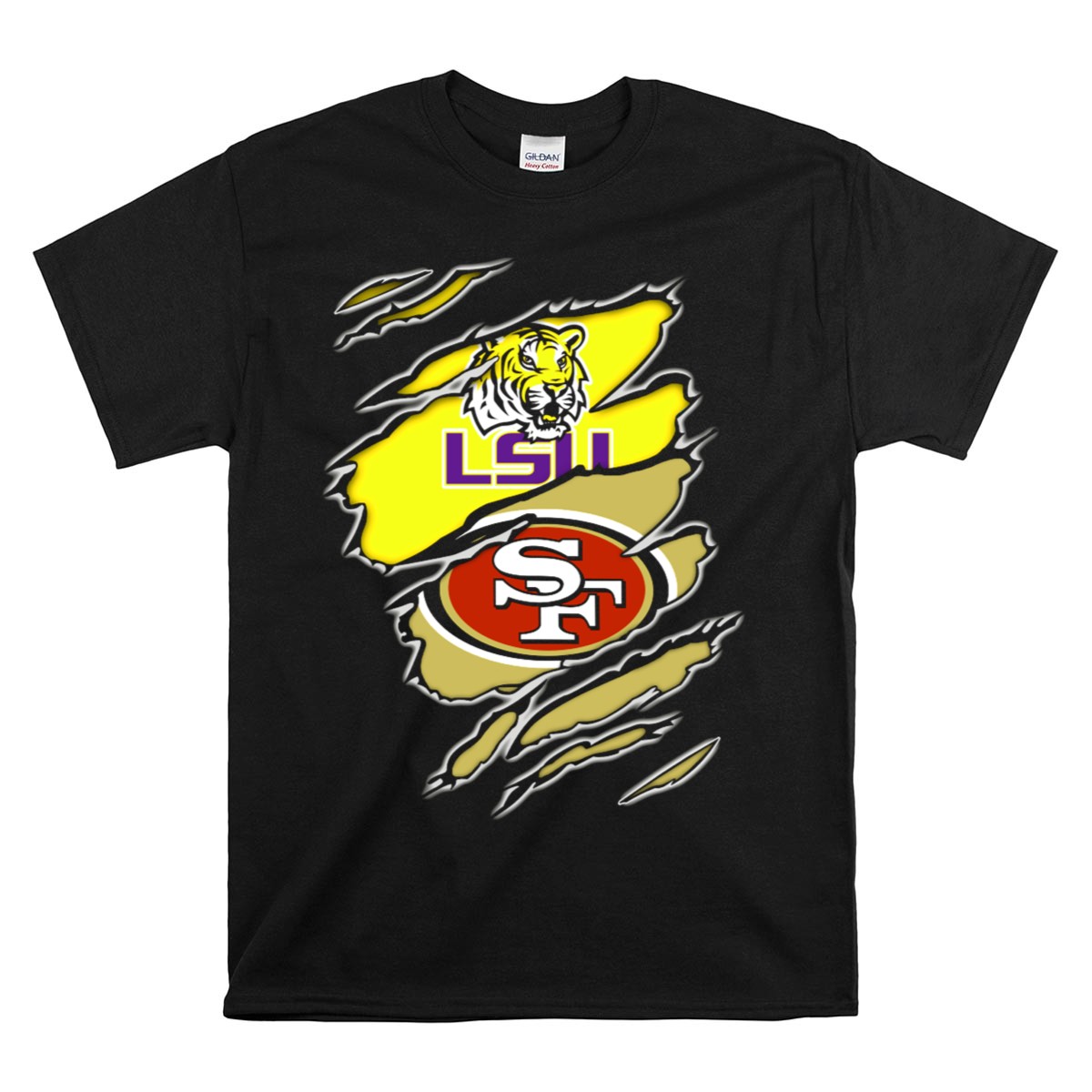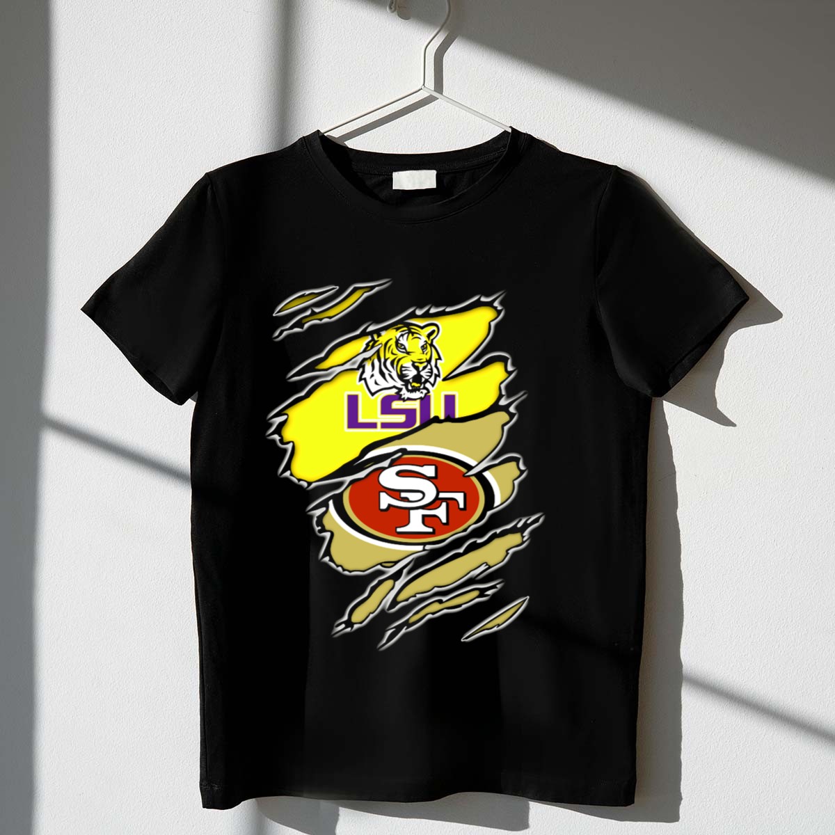 Show your dual allegiance with the LSU Tigers San Francisco 49ers Ripped T-Shirt, a must-have for passionate fans who embrace both college and professional football. This unique fan-made design is perfect for casual outings, themed events, or everyday wear, making it a versatile addition to your wardrobe. With its eye-catching graphic and soft, breathable fabric, this shirt ensures you stand out while staying comfortable throughout the year.