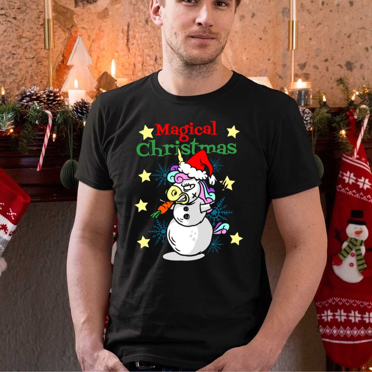 Be the first to review “Magical Christmas Unicorn Snowman With Santa Hat And Stars T Shirt”