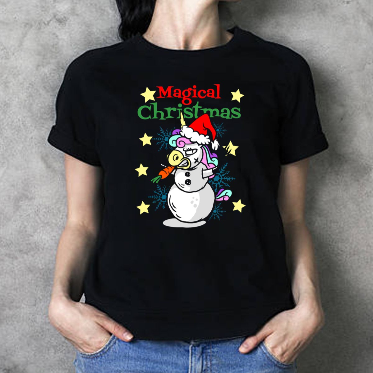 Embrace the magic of the holiday season with our enchanting “Magical Christmas Unicorn Snowman With Santa Hat And Stars” T-shirt! Perfect for unicorn lovers and festive enthusiasts alike, this fan-made design captures the whimsical spirit of Christmas. Whether you’re decking the halls, attending a themed event, or simply enjoying a cozy day at home, this shirt adds a touch of fun and cheer to your casual wear. Made and printed in the USA, it’s a unique addition to your all-season wardrobe.