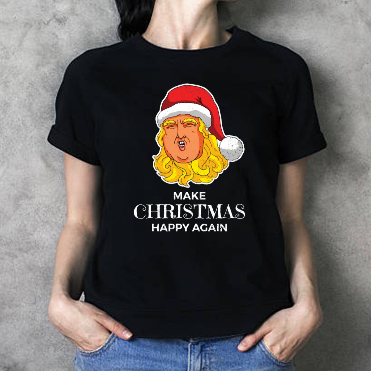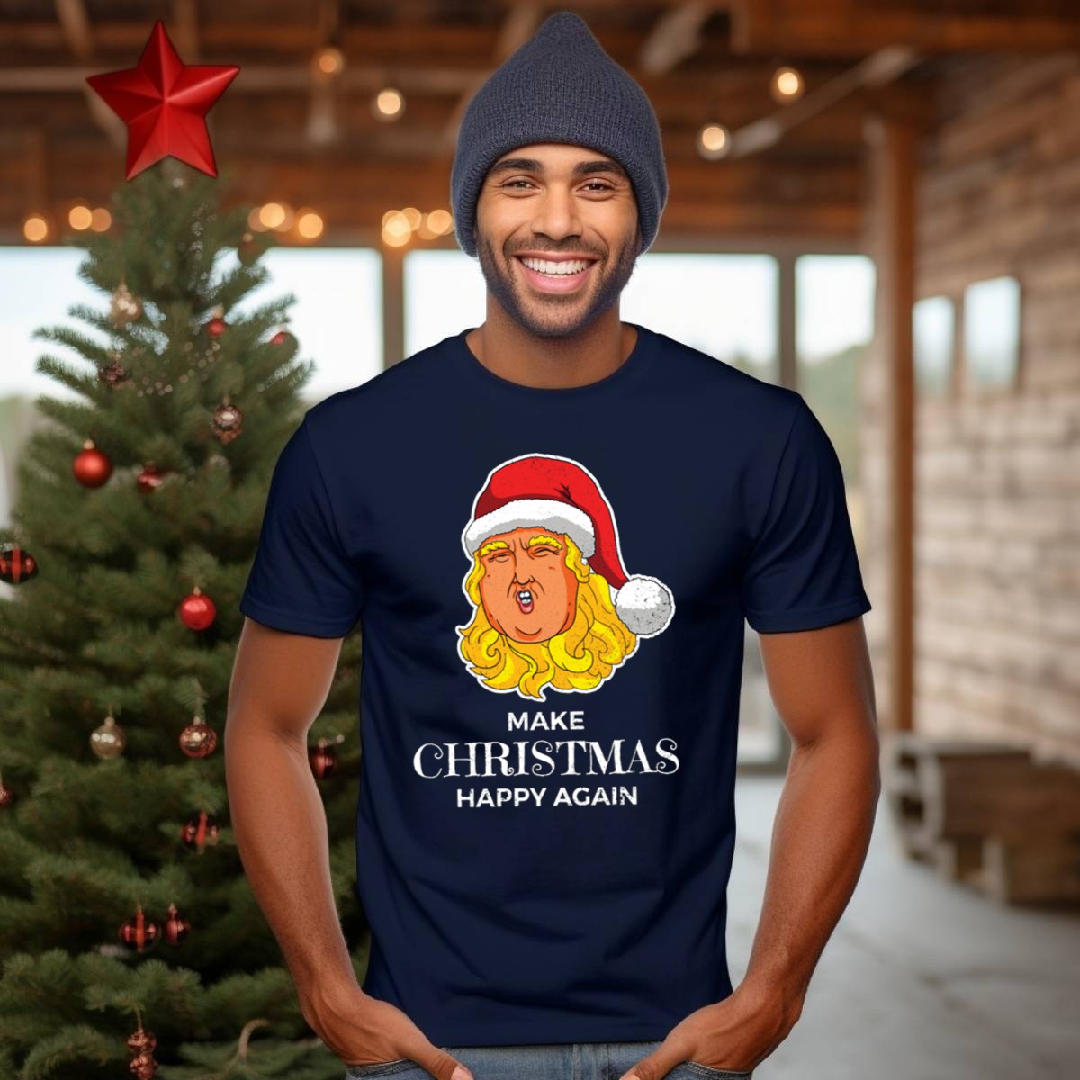 Celebrate the holiday season with a twist on tradition in our “Make Christmas Happy Again” Santa Trump Hat T-Shirt! This fun and festive tee is perfect for those who enjoy a blend of humor and holiday spirit. Whether you’re attending a themed event, gathering with friends, or just looking to spread some cheer during your daily wear, this shirt will surely spark conversations and laughter. Made with care and printed in the USA, it’s a unique addition to any casual wardrobe.