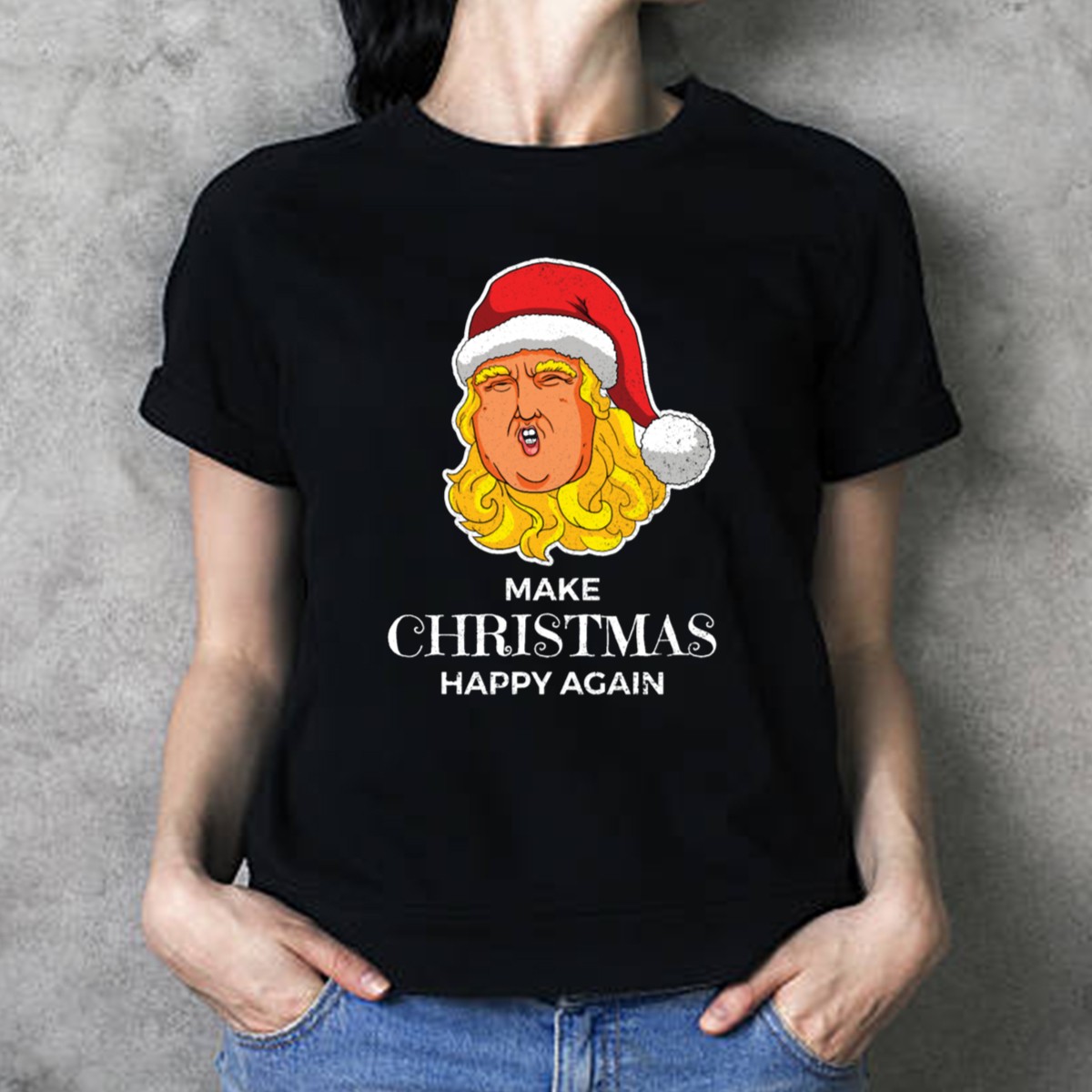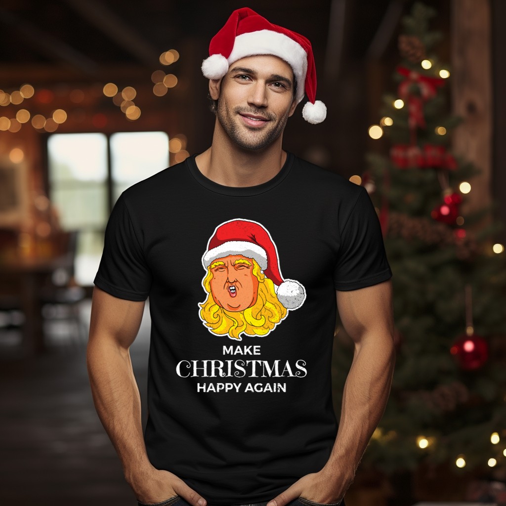 Celebrate the holiday spirit with our “Make Christmas Happy Again” Santa Trump Hat T-Shirt! This playful and festive tee is perfect for those who love to express their unique style during the holiday season. Whether you’re attending a themed event, gathering with friends, or just enjoying a casual day out, this shirt is designed for comfort and fun. Made in the USA, it features a fan-made design that’s sure to turn heads and spark conversations!