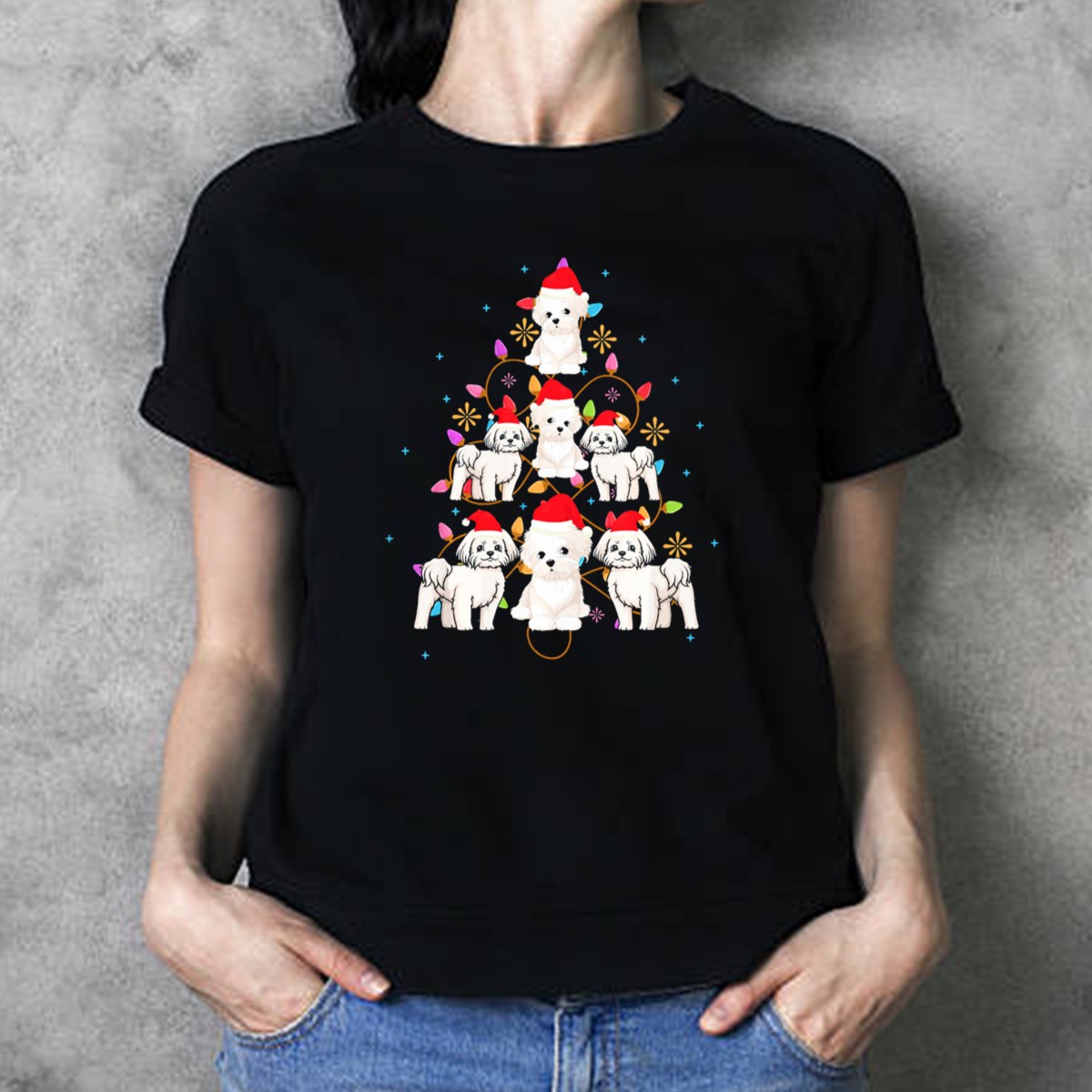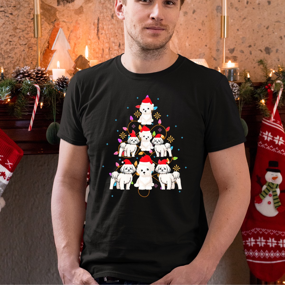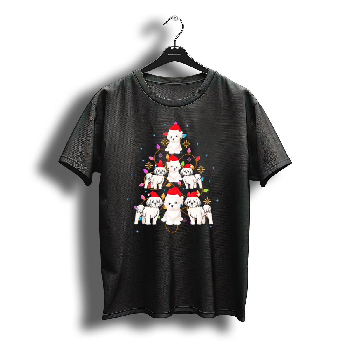 Be the first to review “Maltese Dogs In Santa Hats With Colorful Christmas Tree Lights T-Shirt”