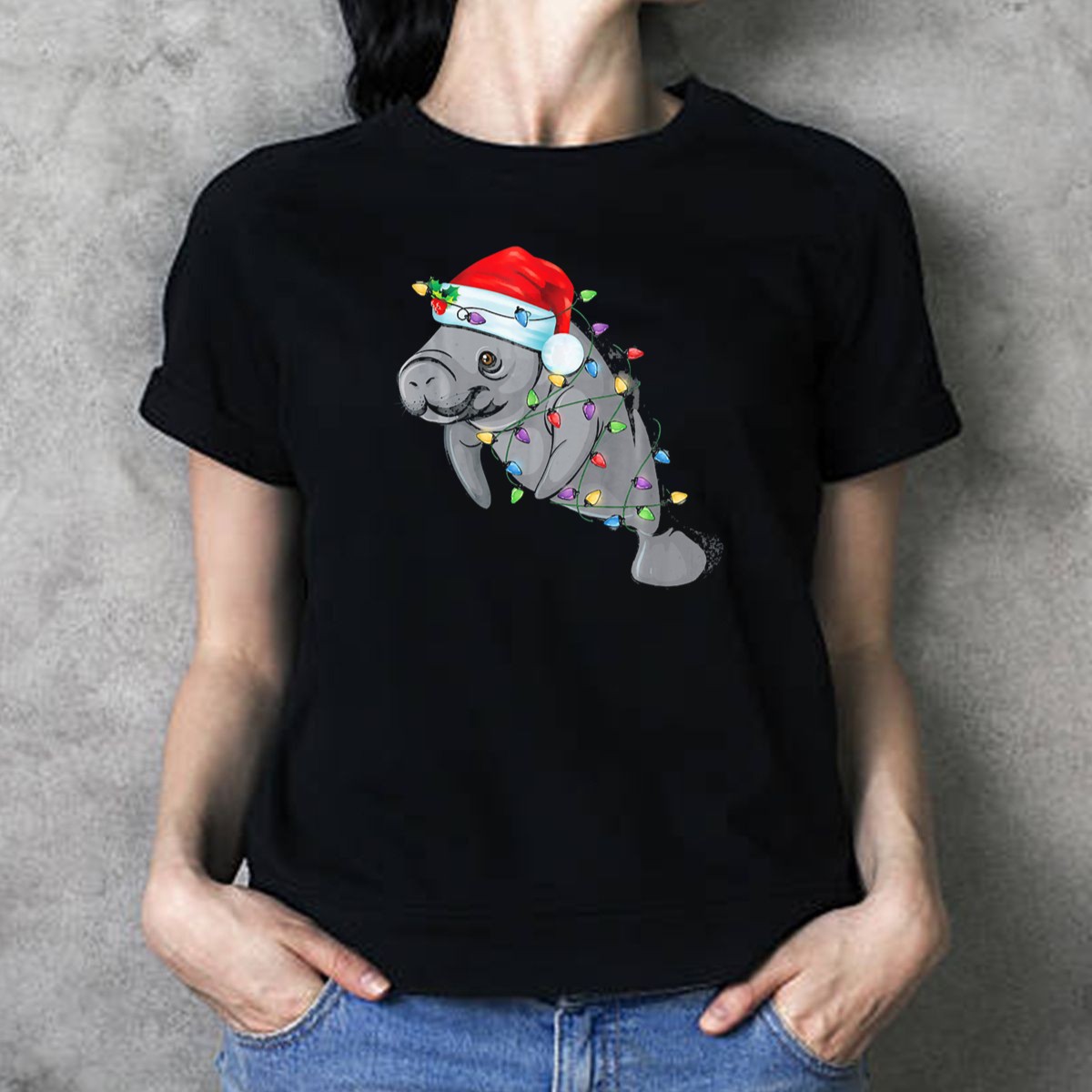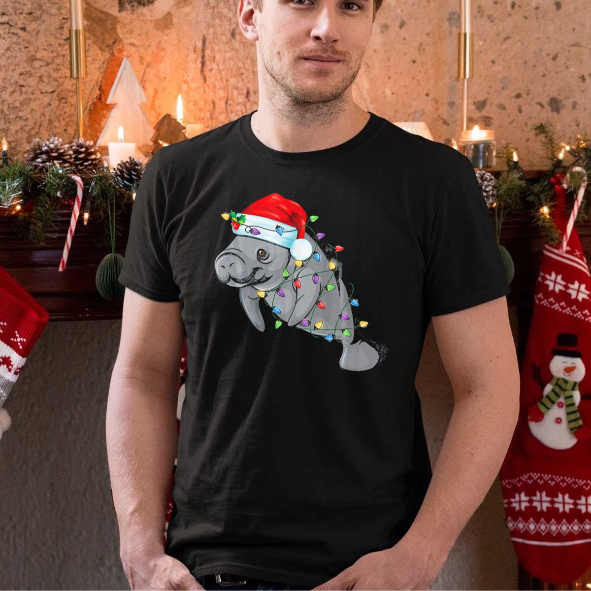 Be the first to review “Manatee Wrapped In Christmas Lights Wearing A Santa Hat T Shirt”