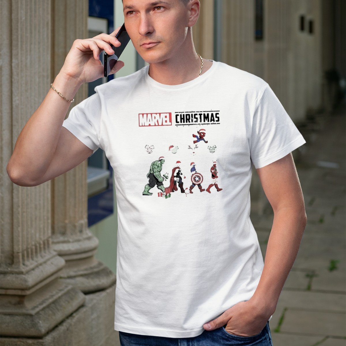 Celebrate the holiday season with our Marvel Christmas Superhero Characters In Santa Hats T-Shirt! Perfect for fans of all ages, this festive tee combines the magic of Christmas with your favorite superheroes, making it an ideal choice for casual wear, themed events, or daily outings during the holiday season. Made with a comfortable fit and vibrant print, this shirt is a unique way to showcase your love for Marvel while spreading holiday cheer!