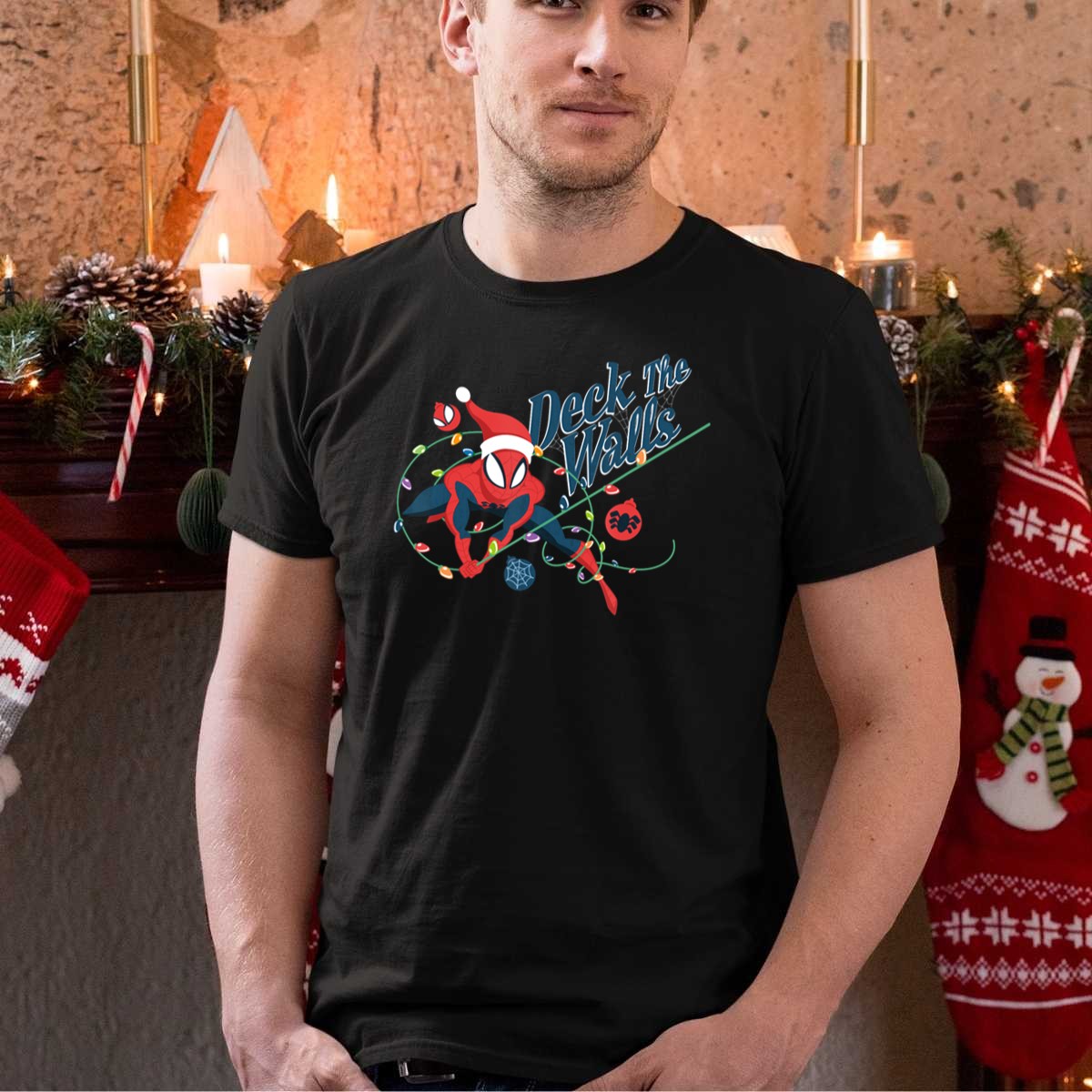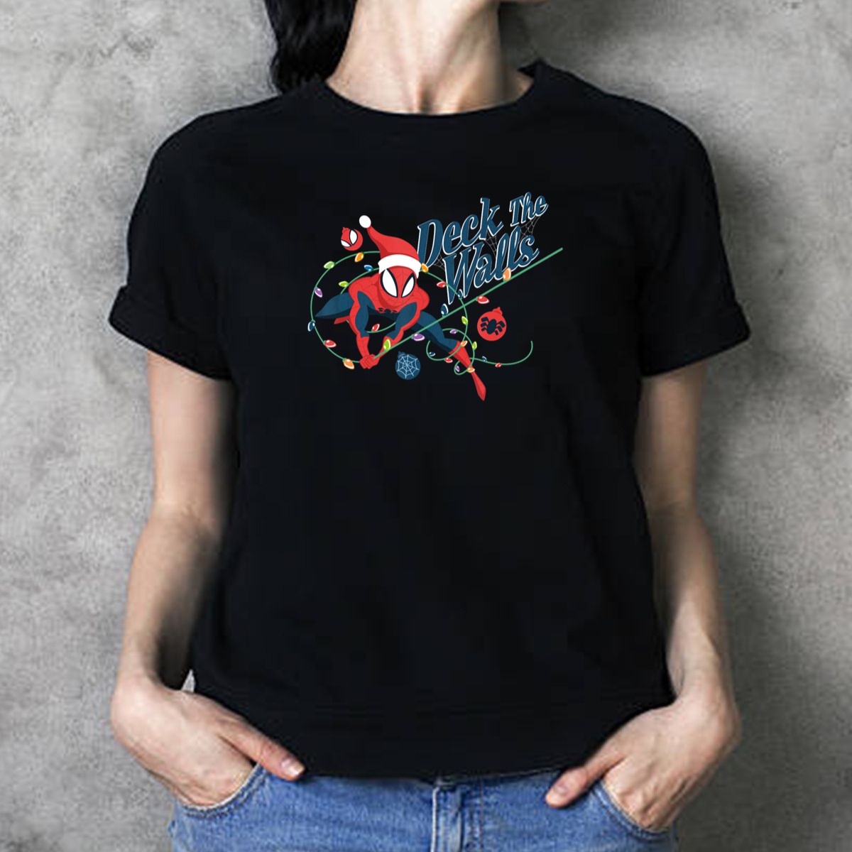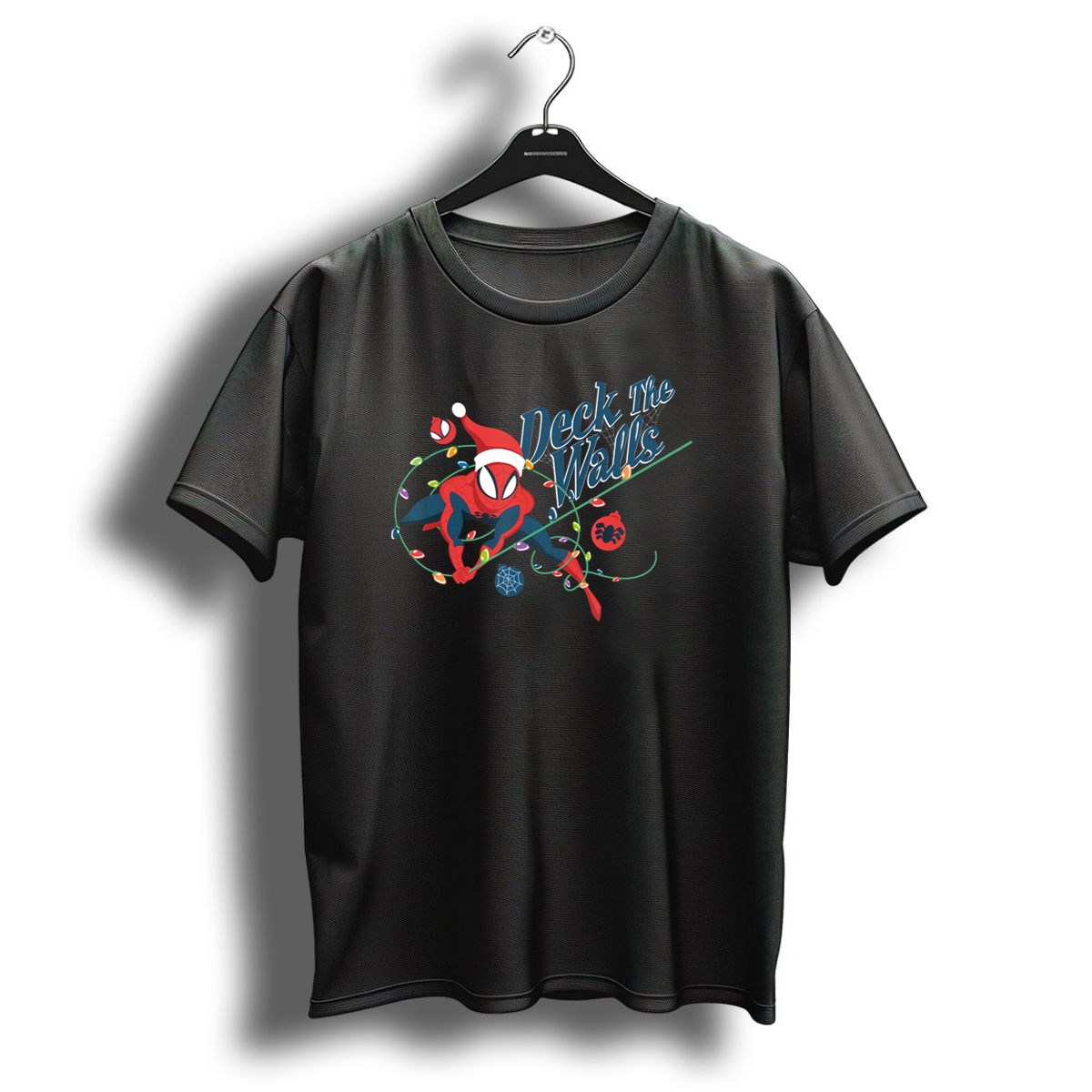 Celebrate the holiday season with our fan-made Marvel Spider Man Deck The Walls T-Shirt! Perfect for fans of all ages, this festive tee brings a playful twist to your winter wardrobe, featuring Spider Man in a merry holiday design complete with Christmas lights and a Santa hat. Ideal for casual wear, themed events, or simply spreading cheer during the holidays, this shirt is a must-have for any Marvel enthusiast who loves to showcase their fandom in style.