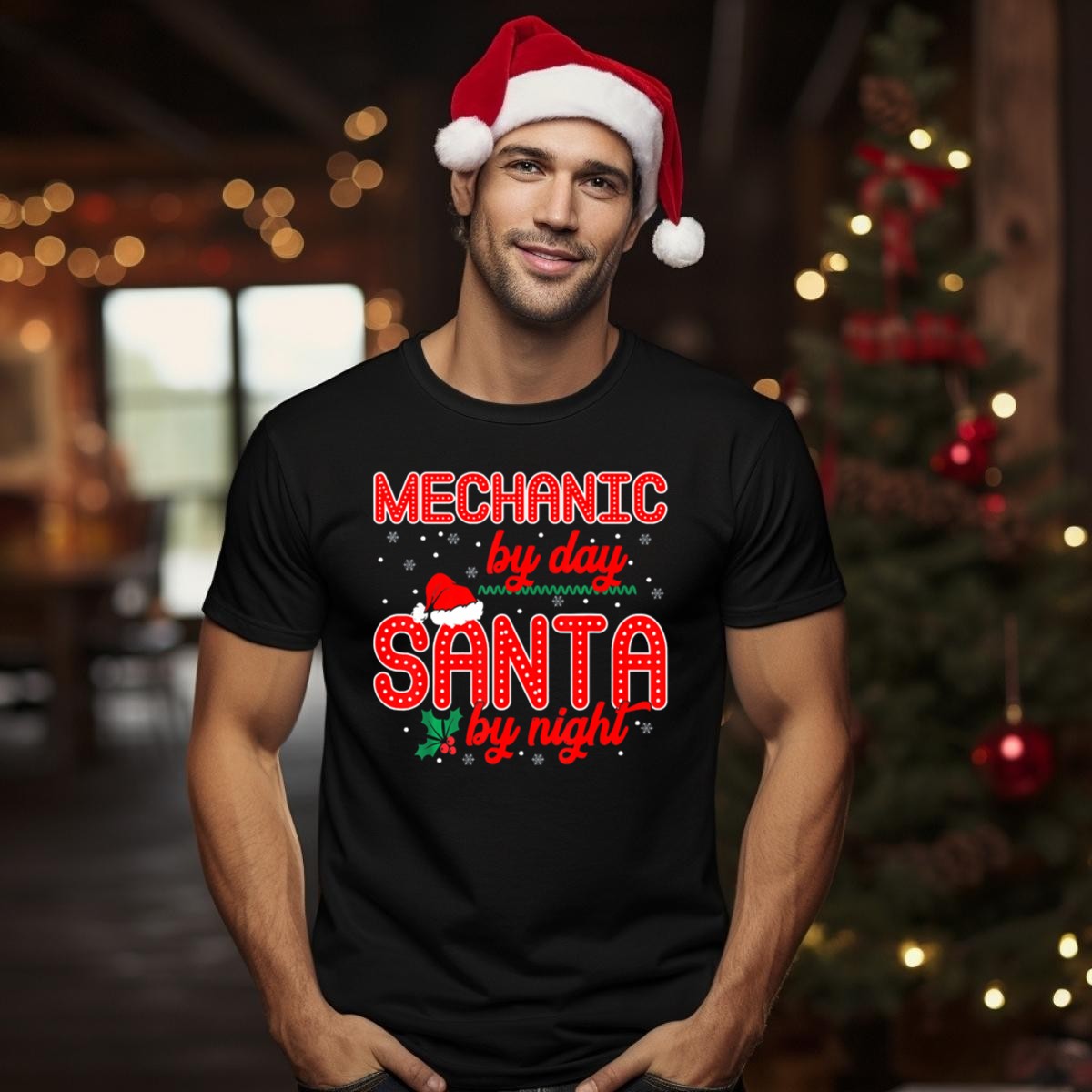 Celebrate the holiday spirit with our “Mechanic By Day, Santa By Night” graphic T-shirt, perfect for those who live life in the fast lane and still make time for festive fun! This fan-made design features a playful Santa hat adorned with holly and snowflakes, making it an ideal choice for casual wear, themed events, or daily outings during the festive season. Crafted for comfort and style, this shirt is sure to become a favorite in your holiday wardrobe.