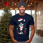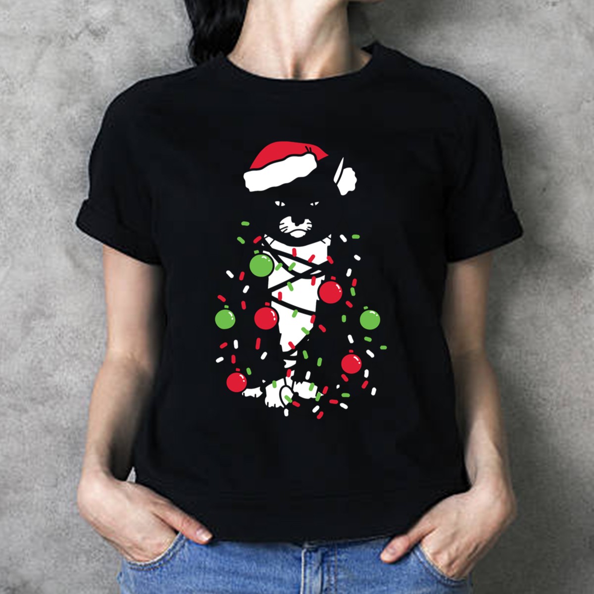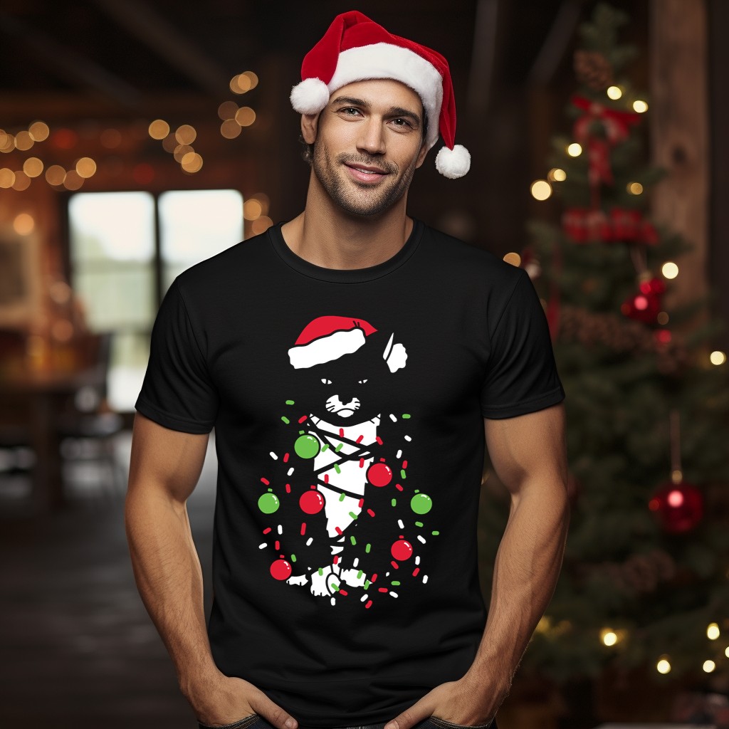 Celebrate the festive season with our delightful “Meowy Christmas” T-shirt, featuring an adorable cat wrapped in holiday lights and sporting a cheerful Santa hat. This fun and whimsical design is perfect for cat lovers and anyone looking to spread holiday cheer at casual gatherings, themed events, or simply while enjoying daily wear. Made in the USA, this fan-made design captures the spirit of Christmas in a unique and playful way that’s sure to bring smiles!