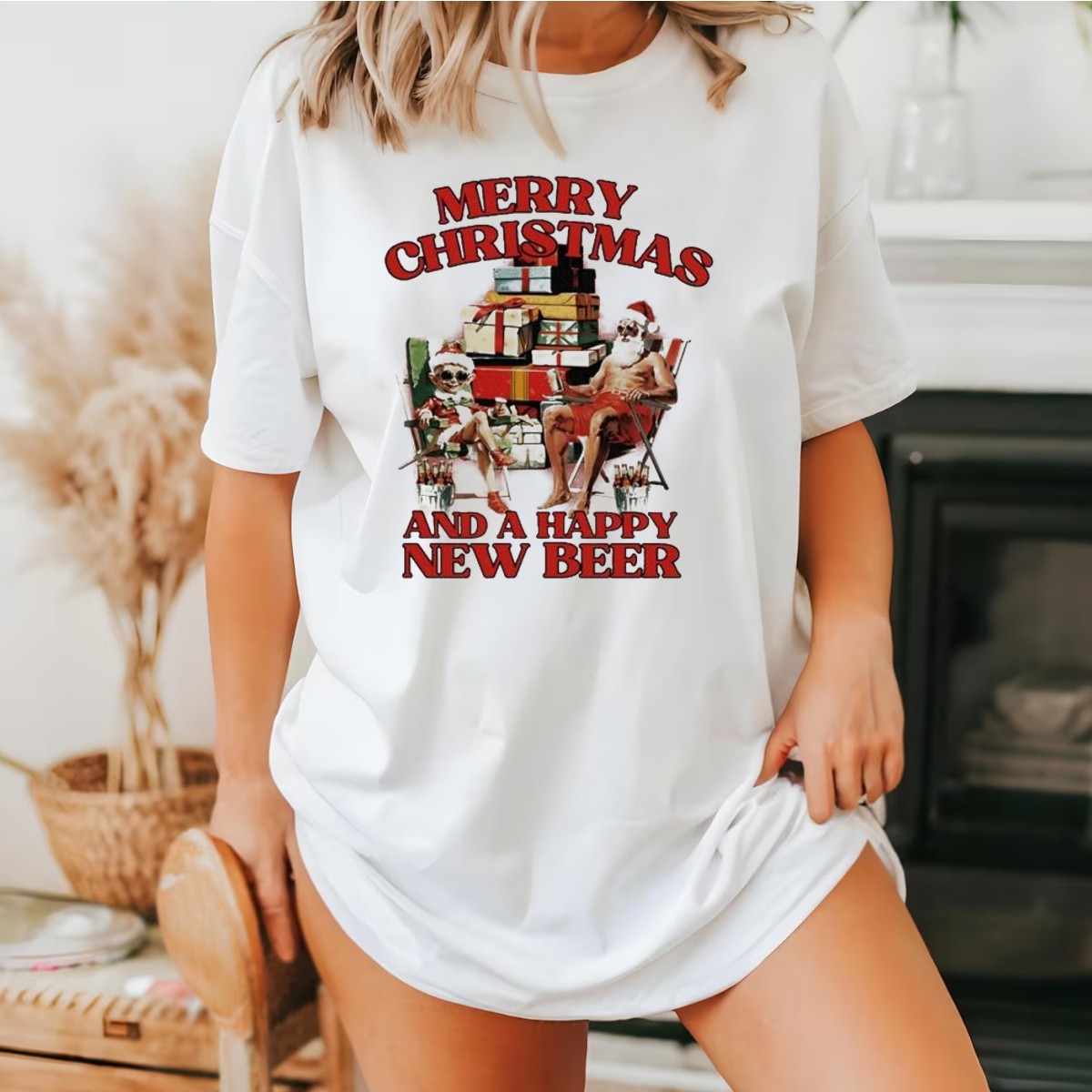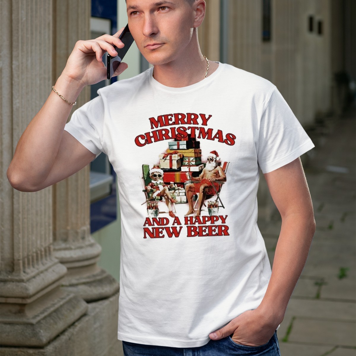 Get into the festive spirit with our Merry Christmas And A Happy New Beer Skeleton Santa And Elf T-Shirt! Perfect for those who love to celebrate the holidays with a quirky twist, this fan-made design features a fun skeleton Santa and elf duo surrounded by gifts, making it an ideal choice for casual gatherings, themed events, or just spreading some holiday cheer during your daily wear. Printed in the USA, this shirt combines humor with high-quality craftsmanship to ensure you stand out this season.