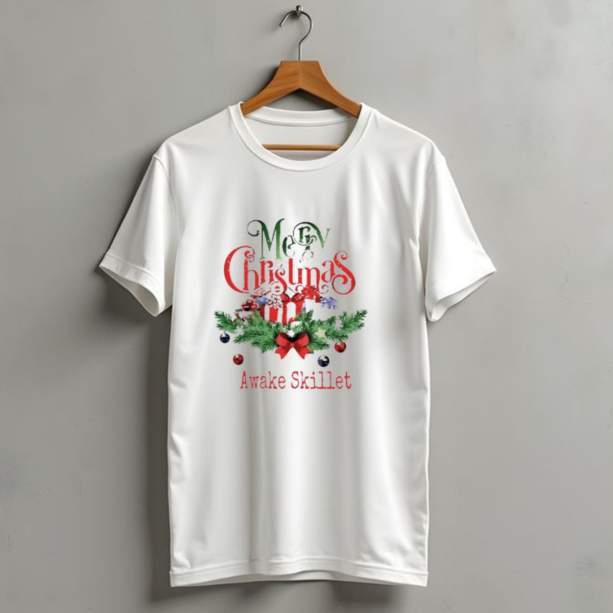 Celebrate the holiday season in style with our Merry Christmas Awake Skillet Festive Presents And Pine Garland T-Shirt! This fan-made design, printed in the USA, is perfect for anyone looking to spread cheer at casual gatherings, themed events, or during daily wear. With its classic fit and soft cotton material, this shirt combines comfort and festive flair, making it a must-have for your all-season wardrobe.