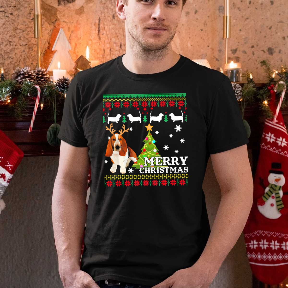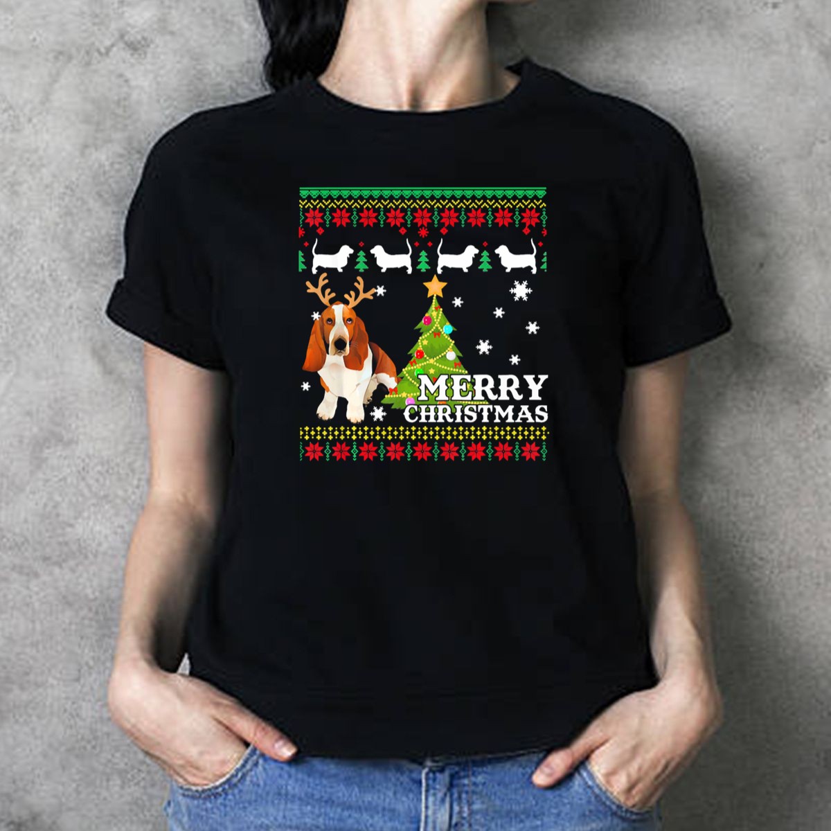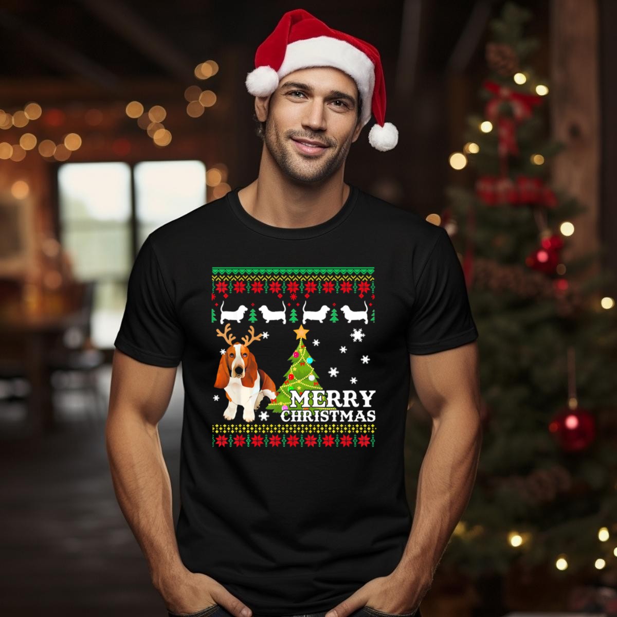 Celebrate the holiday season in style with our Merry Christmas Basset Hound Reindeer Ugly Sweater Holiday Tree T-Shirt! Perfect for dog lovers and festive gatherings, this fun and quirky design adds a touch of whimsy to your casual wear. Ideal for themed events, family gatherings, or simply spreading holiday cheer, this shirt is a must-have for anyone looking to showcase their love for Basset Hounds and embrace the holiday spirit. Made with comfort and durability in mind, this shirt is printed in the USA, ensuring a unique flair for your festive wardrobe.
