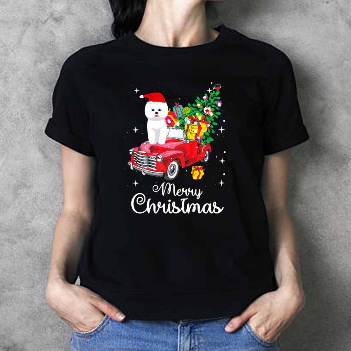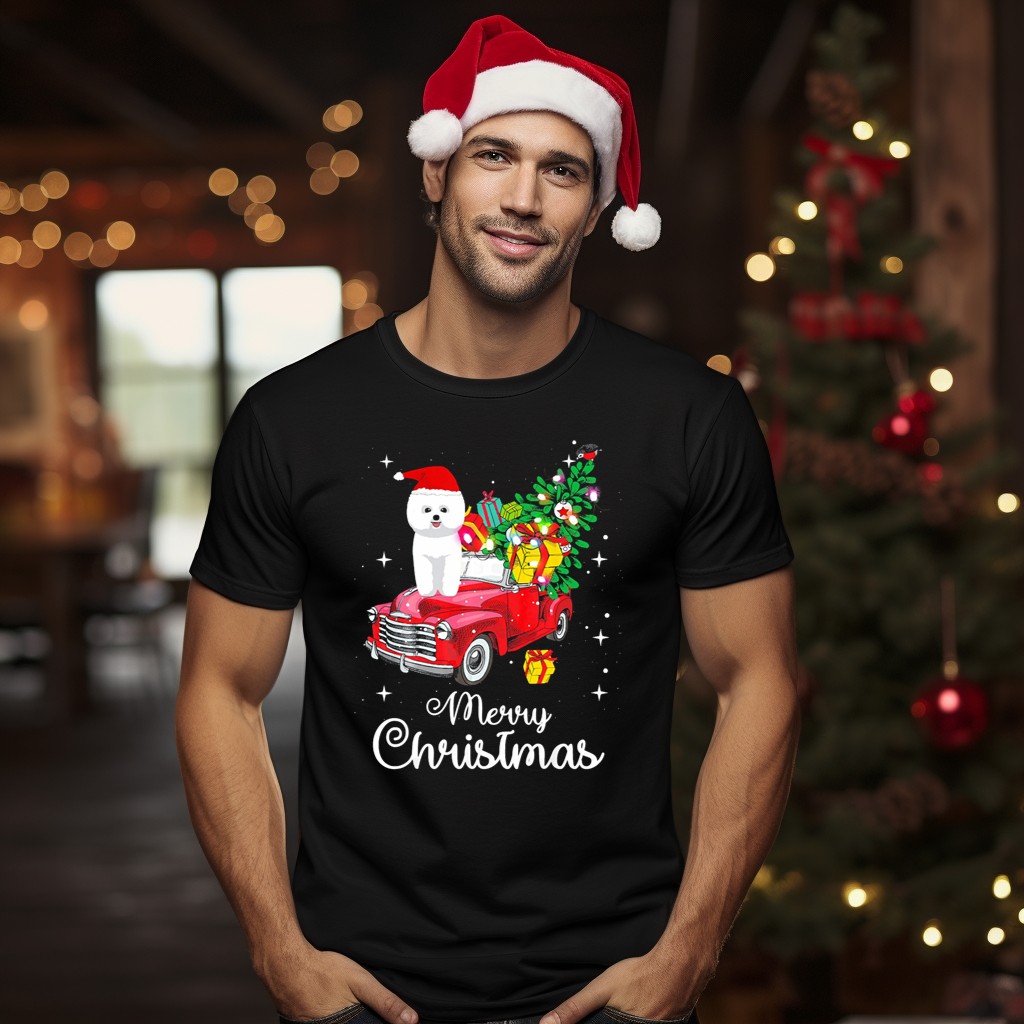 Be the first to review “Merry Christmas Bichon Frise Santa Hat On Red Truck With Gifts And Tree T-Shirt”