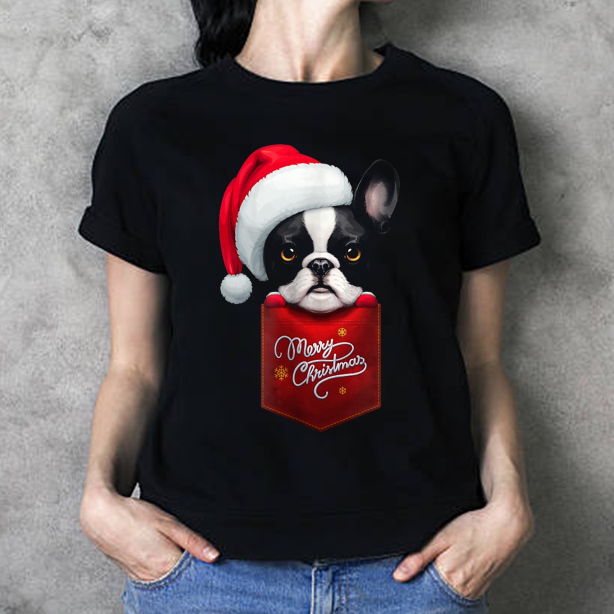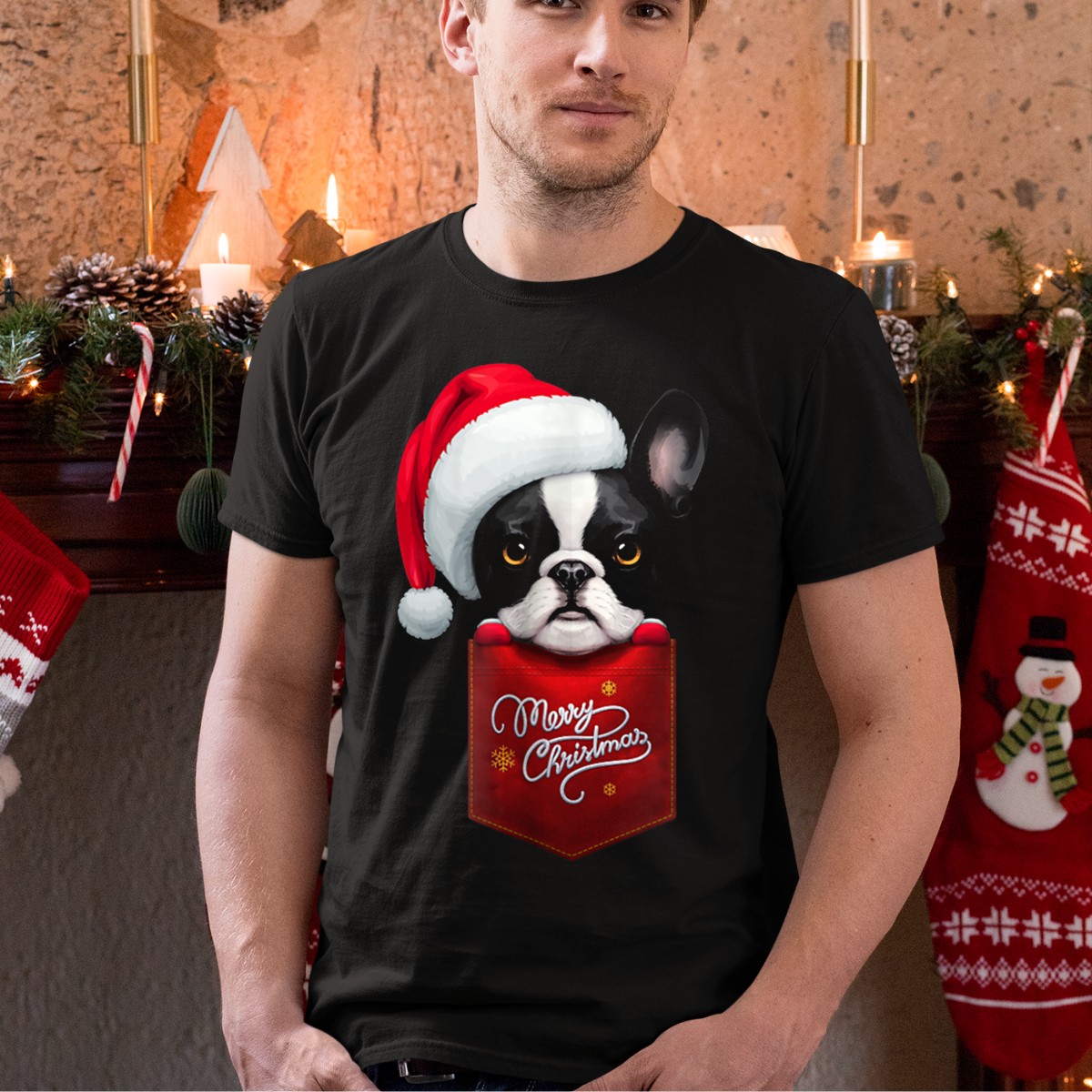 Be the first to review “Merry Christmas Black White French Bulldog In Santa Hat Red Chest Pocket T-Shirt”