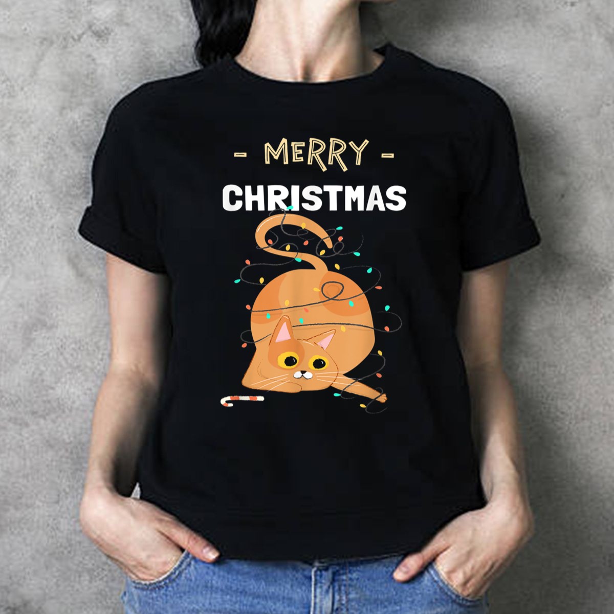 Be the first to review “Merry Christmas Cat Wrapped In Holiday Lights With Candy Cane T Shirt”