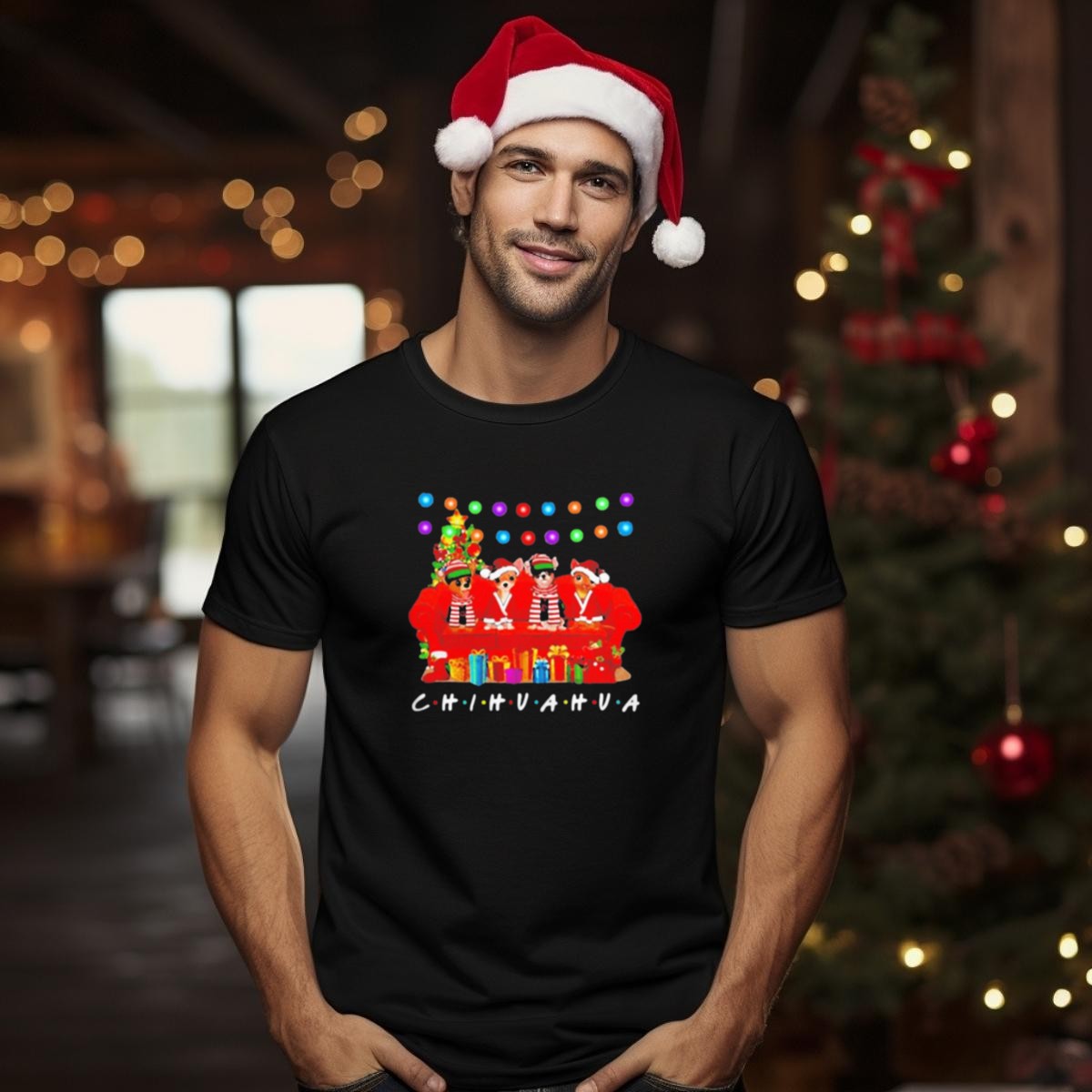 Merry Christmas Chihuahua Friends On Festive Couch With Colorful Lights And Presents T Shirt