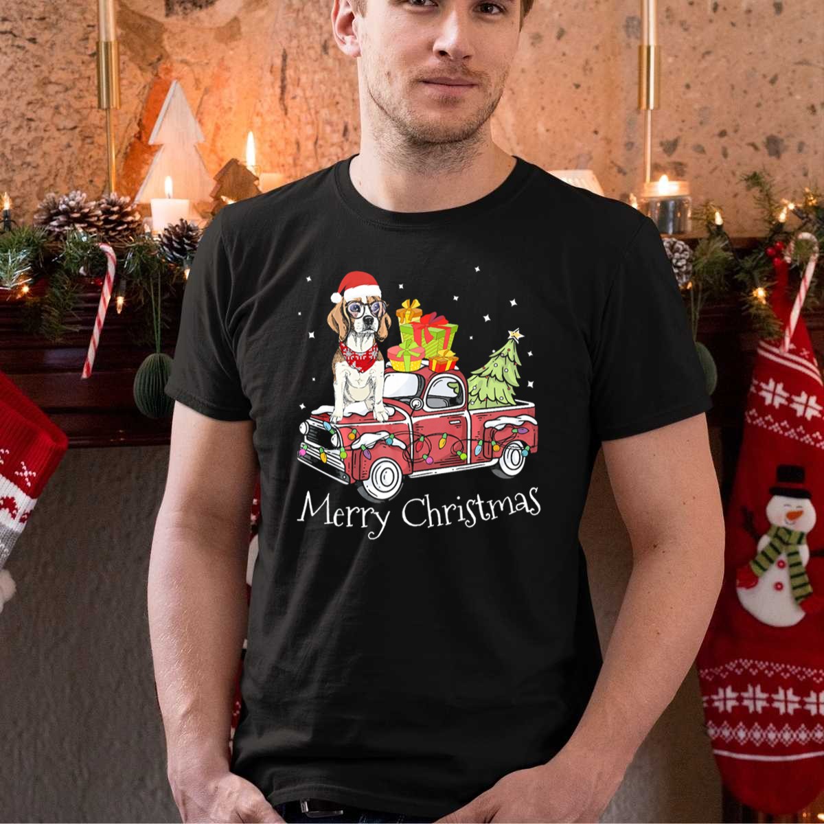 Merry Christmas Cute Beagle Dog On Pickup Truck With Gifts And Tree T-Shirt
