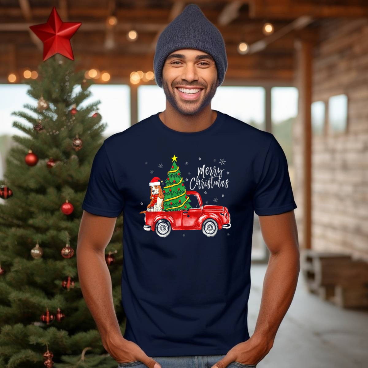 Merry Christmas Cute Cocker Spaniel Red Truck Christmas Tree T-Shirt
