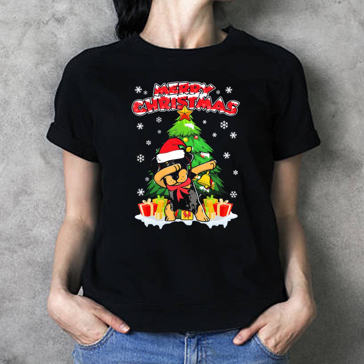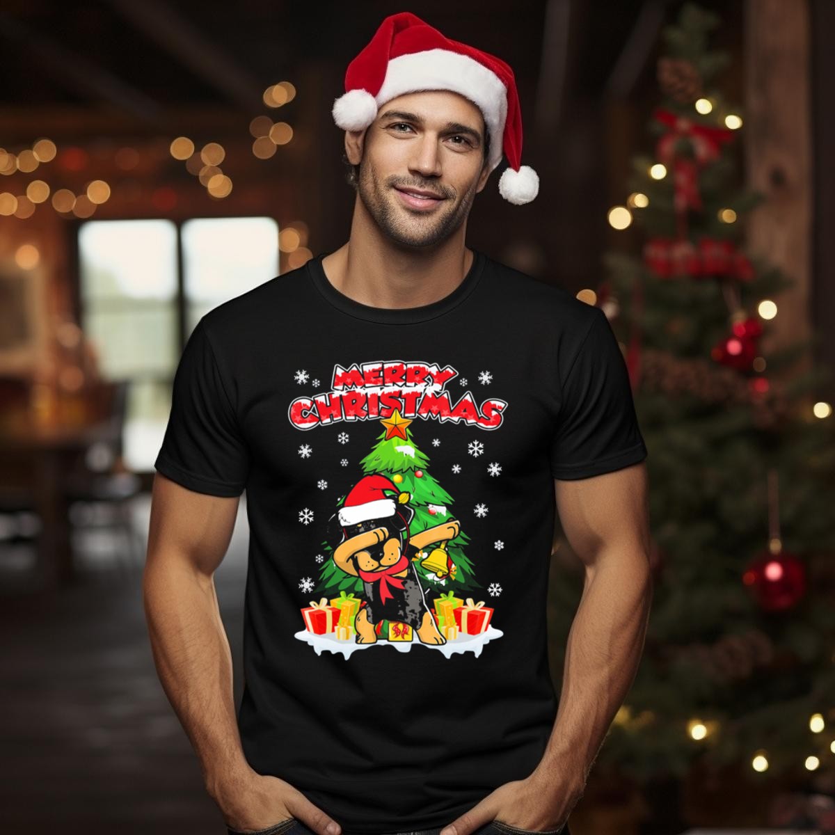 Celebrate the festive season with our Merry Christmas Dabbing Rottweiler T-Shirt! Perfect for dog lovers and those who want to spread holiday cheer, this shirt features a fun and playful design of a dabbing Rottweiler wearing a Santa hat, surrounded by gifts. Ideal for casual wear, themed events, or just lounging around during the holidays, this shirt is sure to bring smiles and laughter wherever you go.